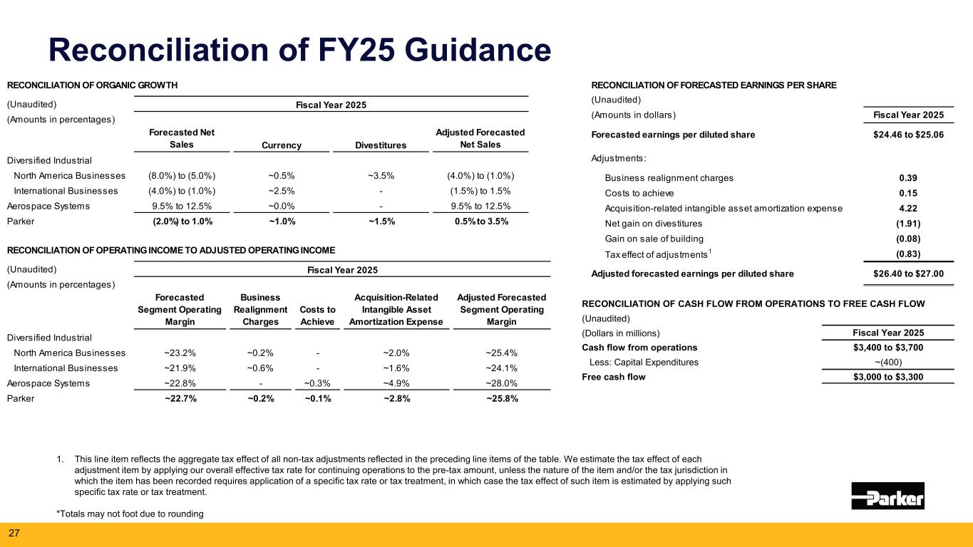 Reconciliation of FY25 Guidance 1. This line item reflects the aggregate tax effect of all non-tax adjustments reflected in the preceding line items of the table. We estimate the tax effect of each adjustment item by applying our overall effective tax rate for continuing operations to the pre-tax amount, unless the nature of the item and/or the tax jurisdiction in which the item has been recorded requires application of a specific tax rate or tax treatment, in which case the tax effect of such item is estimated by applying such specific tax rate or tax treatment. *Totals may not foot due to rounding 27 RECONCILIATION OF CASH FLOW FROM OPERATIONS TO FREE CASH FLOW (Unaudited) (Dollars in millions) Fiscal Year 2025 Cash flow from operations $3,400 to $3,700 Less: Capital Expenditures ~(400) Free cash flow $3,000 to $3,300 RECONCILIATION OF OPERATING INCOME TO ADJUSTED OPERATING INCOME (Unaudited) Fiscal Year 2025 (Amounts in percentages) Forecasted Segment Operating Margin Business Realignment Charges Costs to Achieve Acquisition-Related Intangible Asset Amortization Expense Adjusted Forecasted Segment Operating Margin Diversified Industrial North America Businesses ~23.2% ~0.2% - ~2.0% ~25.4% International Businesses ~21.9% ~0.6% - ~1.6% ~24.1% Aerospace Systems ~22.8% - ~0.3% ~4.9% ~28.0% Parker ~22.7% ~0.2% ~0.1% ~2.8% ~25.8% RECONCILIATION OF ORGANIC GROWTH (Unaudited) Fiscal Year 2025 (Amounts in percentages) Forecasted Net Sales Currency Divestitures Adjusted Forecasted Net Sales Diversified Industrial North America Businesses (8.0%) to (5.0%) ~0.5% ~3.5% (4.0%) to (1.0%) International Businesses (4.0%) to (1.0%) ~2.5% - (1.5%) to 1.5% Aerospace Systems 9.5% to 12.5% ~0.0% - 9.5% to 12.5% Parker (2.0%) to 1.0% ~1.0% ~1.5% 0.5% to 3.5% RECONCILIATION OF FORECASTED EARNINGS PER SHARE (Unaudited) (Amounts in dollars) Fiscal Year 2025 Forecasted earnings per diluted share $24.46 to $25.06 Adjustments: Business realignment charges 0.39 Costs to achieve 0.15 Acquisition-related intangible asset amortization expense 4.22 Net gain on divestitures (1.91) Gain on sale of building (0.08) Tax effect of adjustments1 (0.83) Adjusted forecasted earnings per diluted share $26.40 to $27.00