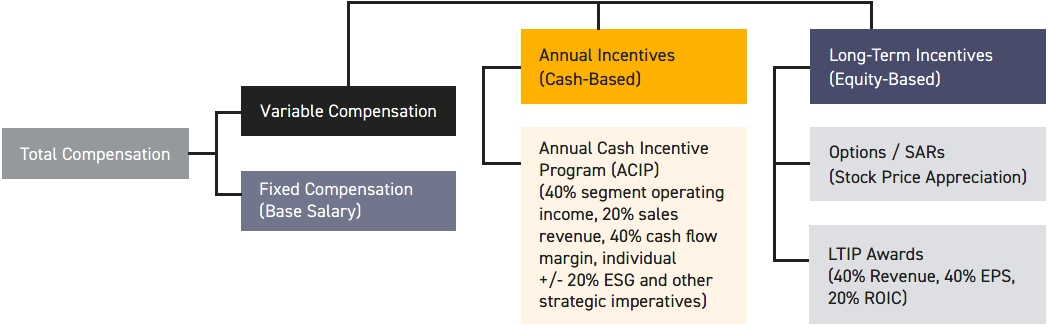 Incentivizes executive officers to maximize long-term revenue growth, earnings per share ("EPS") growth, and growth in average return on invested capital ("ROIC") by focusing on various key business strategies, such as market-driven innovation, on-time delivery of quality products, value-added services and systems, strategic supply chain, lean enterprise, value pricing and profitable growth | ||||