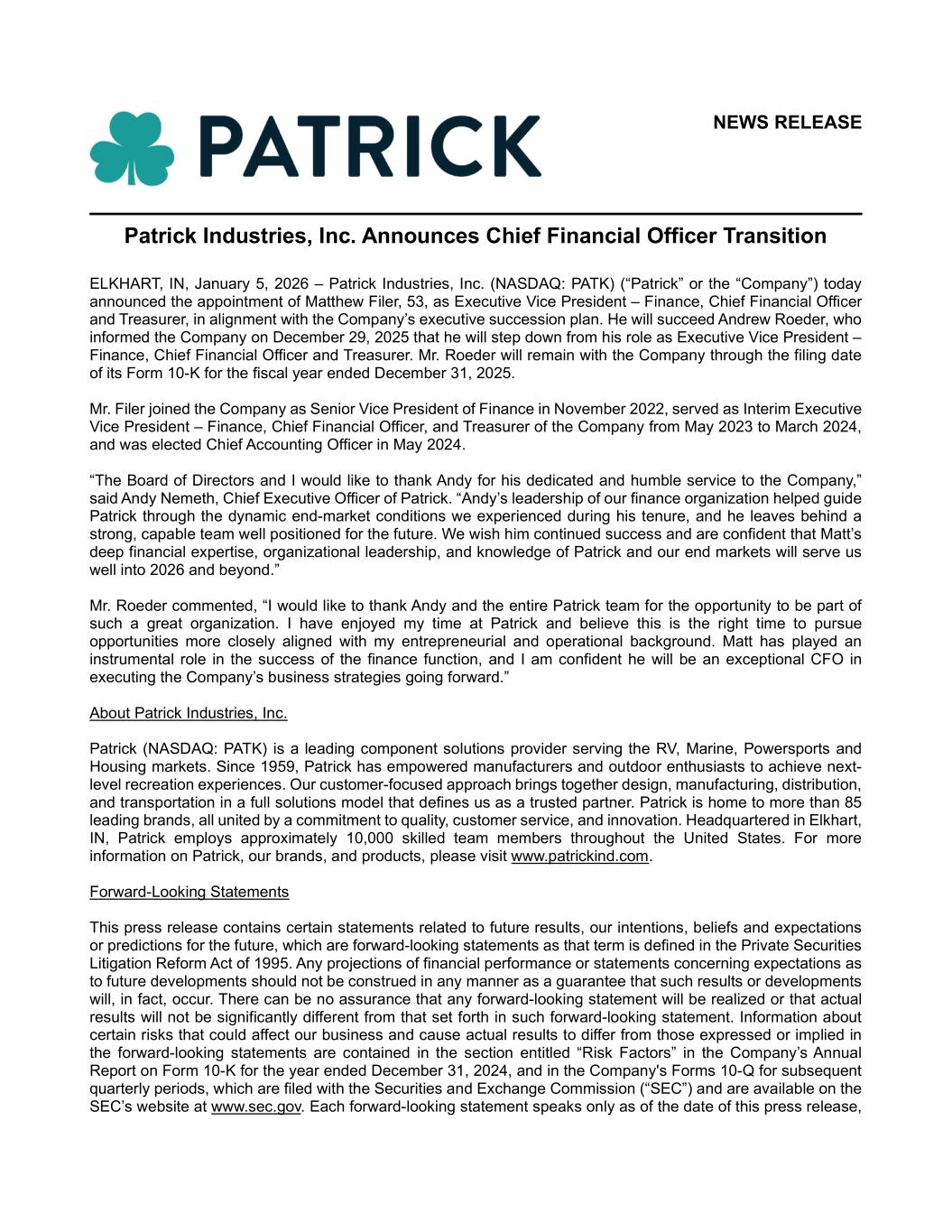 NEWS RELEASE Patrick Industries, Inc. Announces Chief Financial Officer Transition ELKHART, IN, January 5, 2026 – Patrick Industries, Inc. (NASDAQ: PATK) (“Patrick” or the “Company”) today announced the appointment of Matthew Filer, 53, as Executive Vice President – Finance, Chief Financial Officer and Treasurer, in alignment with the Company’s executive succession plan. He will succeed Andrew Roeder, who informed the Company on December 29, 2025 that he will step down from his role as Executive Vice President – Finance, Chief Financial Officer and Treasurer. Mr. Roeder will remain with the Company through the filing date of its Form 10-K for the fiscal year ended December 31, 2025. Mr. Filer joined the Company as Senior Vice President of Finance in November 2022, served as Interim Executive Vice President – Finance, Chief Financial Officer, and Treasurer of the Company from May 2023 to March 2024, and was elected Chief Accounting Officer in May 2024. “The Board of Directors and I would like to thank Andy for his dedicated and humble service to the Company,” said Andy Nemeth, Chief Executive Officer of Patrick. “Andy’s leadership of our finance organization helped guide Patrick through the dynamic end-market conditions we experienced during his tenure, and he leaves behind a strong, capable team well positioned for the future. We wish him continued success and are confident that Matt’s deep financial expertise, organizational leadership, and knowledge of Patrick and our end markets will serve us well into 2026 and beyond.” Mr. Roeder commented, “I would like to thank Andy and the entire Patrick team for the opportunity to be part of such a great organization. I have enjoyed my time at Patrick and believe this is the right time to pursue opportunities more closely aligned with my entrepreneurial and operational background. Matt has played an instrumental role in the success of the finance function, and I am confident he will be an exceptional CFO in executing the Company’s business strategies going forward.” About Patrick Industries, Inc. Patrick (NASDAQ: PATK) is a leading component solutions provider serving the RV, Marine, Powersports and Housing markets. Since 1959, Patrick has empowered manufacturers and outdoor enthusiasts to achieve next- level recreation experiences. Our customer-focused approach brings together design, manufacturing, distribution, and transportation in a full solutions model that defines us as a trusted partner. Patrick is home to more than 85 leading brands, all united by a commitment to quality, customer service, and innovation. Headquartered in Elkhart, IN, Patrick employs approximately 10,000 skilled team members throughout the United States. For more information on Patrick, our brands, and products, please visit www.patrickind.com. Forward-Looking Statements This press release contains certain statements related to future results, our intentions, beliefs and expectations or predictions for the future, which are forward-looking statements as that term is defined in the Private Securities Litigation Reform Act of 1995. Any projections of financial performance or statements concerning expectations as to future developments should not be construed in any manner as a guarantee that such results or developments will, in fact, occur. There can be no assurance that any forward-looking statement will be realized or that actual results will not be significantly different from that set forth in such forward-looking statement. Information about certain risks that could affect our business and cause actual results to differ from those expressed or implied in the forward-looking statements are contained in the section entitled “Risk Factors” in the Company’s Annual Report on Form 10-K for the year ended December 31, 2024, and in the Company's Forms 10-Q for subsequent quarterly periods, which are filed with the Securities and Exchange Commission (“SEC”) and are available on the SEC’s website at www.sec.gov. Each forward-looking statement speaks only as of the date of this press release,