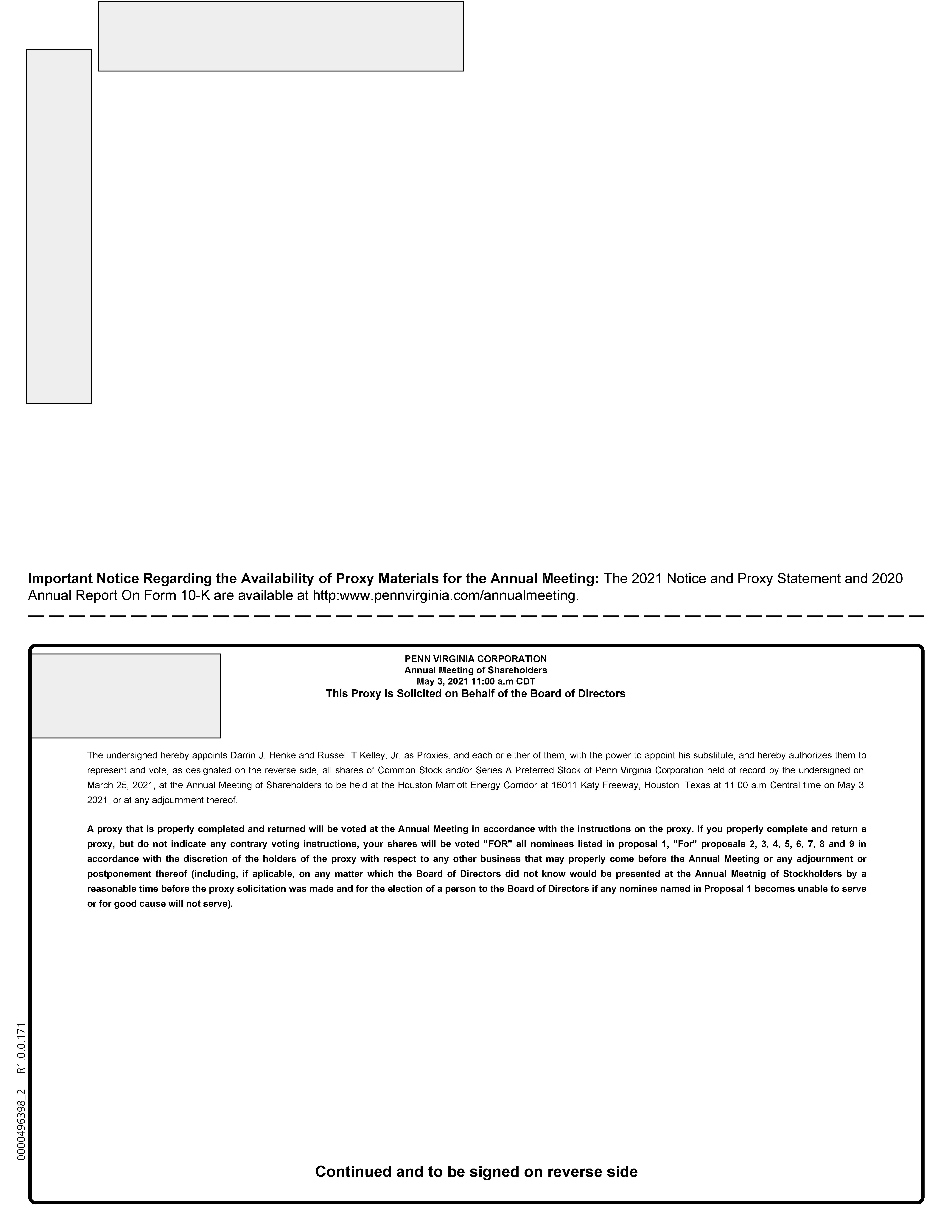 This Proxy Statement and the accompanying proxy card are being furnished to shareholders of Penn Virginia Corporation, which is referred to in this Proxy Statement as the “Company,” “we,” “us” or “our,” in connection with the solicitation by or on behalf of the Board of Directors of the Company, or the “Board,” of proxies to be voted at the 2021 Annual Meeting of Shareholders, or the “Annual Meeting,” to be held at 11:00 a.m., Central time, on Monday, May 3, 2021 and at any adjournment, postponement or continuation thereof. The Annual Meeting will be held at the Houston Marriott Energy Corridor at 16011 Katy Freeway, Houston, Texas. This Proxy Statement and the accompanying proxy card are first being mailed on or about , 2021. Our principal executive offices are located at 16285 Park Ten Place, Suite 500, Houston, Texas 77084.