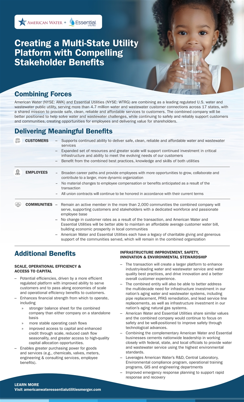 + Creating a Multi-State Utility Platform with Compelling Stakeholder Benefits Combining Forces American Water (NYSE: AWK) and Essential Utilities (NYSE: WTRG) are combining as a leading regulated U.S. water and wastewater public utility, serving more than 4.7 million water and wastewater customer connections across 17 states, with a shared mission to provide safe, clean, reliable and affordable services to customers. The combined company will be better positioned to help solve water and wastewater challenges, while continuing to safely and reliably support customers and communities, creating opportunities for employees and delivering value for shareholders. Delivering Meaningful Benefits CUSTOMERS – Supports continued ability to deliver safe, clean, reliable and affordable water and wastewater services – Expanded set of resources and greater scale will support continued investment in critical infrastructure and ability to meet the evolving needs of our customers – Benefit from the combined best practices, knowledge and skills of both utilities EMPLOYEES – Broaden career paths and provide employees with more opportunities to grow, collaborate and contribute to a larger, more dynamic organization – No material changes to employee compensation or benefits anticipated as a result of the transaction – All union contracts will continue to be honored in accordance with their current terms COMMUNITIES – Remain an active member in the more than 2,000 communities the combined company will serve, supporting customers and stakeholders with a dedicated workforce and passionate employee base – No change in customer rates as a result of the transaction, and American Water and Essential Utilities will be better able to maintain an affordable average customer water bill, building economic prosperity in local communities – American Water and Essential Utilities each have a legacy of charitable giving and generous support of the communities served, which will remain in the combined organization INFRASTRUCTURE IMPROVEMENT, SAFETY, Additional Benefits INNOVATION & ENVIRONMENTAL STEWARDSHIP – The transaction will create a larger platform to enhance SCALE, OPERATIONAL EFFICIENCY & industry-leading water and wastewater service and water ACCESS TO CAPITAL quality best practices, and drive innovation and a better – Potential efficiencies, driven by a more efficient overall customer experience. regulated platform with improved ability to serve – The combined entity will also be able to better address customers and to pass along economies of scale the multidecade need for infrastructure investment in our and operational efficiency benefits to customers. nation’s aging water and wastewater systems, including – Enhances financial strength from which to operate, pipe replacement, PFAS remediation, and lead service line including replacements, as well as infrastructure investment in our » stronger balance sheet for the combined nation’s aging natural gas systems. company than either company on a standalone – American Water and Essential Utilities share similar values basis and the combined company would continue to focus on safety and be well-positioned to improve safety through » more stable operating cash flows technological advances. » improved access to capital and enhanced – Combining the complementary American Water and Essential credit through scale, reduced cash flow businesses cements nationwide leadership in working seasonality, and greater access to high-quality closely with federal, state, and local officials to provide water capital allocation opportunities. and wastewater service using the highest environmental – Enables greater purchasing power for goods standards. and services (e.g., chemicals, valves, meters, – Leverages American Water’s R&D, Central Laboratory, engineering & consulting services, employee Environmental compliance program, operational training benefits). programs, GIS and engineering departments – Improved emergency response planning to support rapid response and recovery LEARN MORE Visit americanwateressentialutilitiesmerger.com