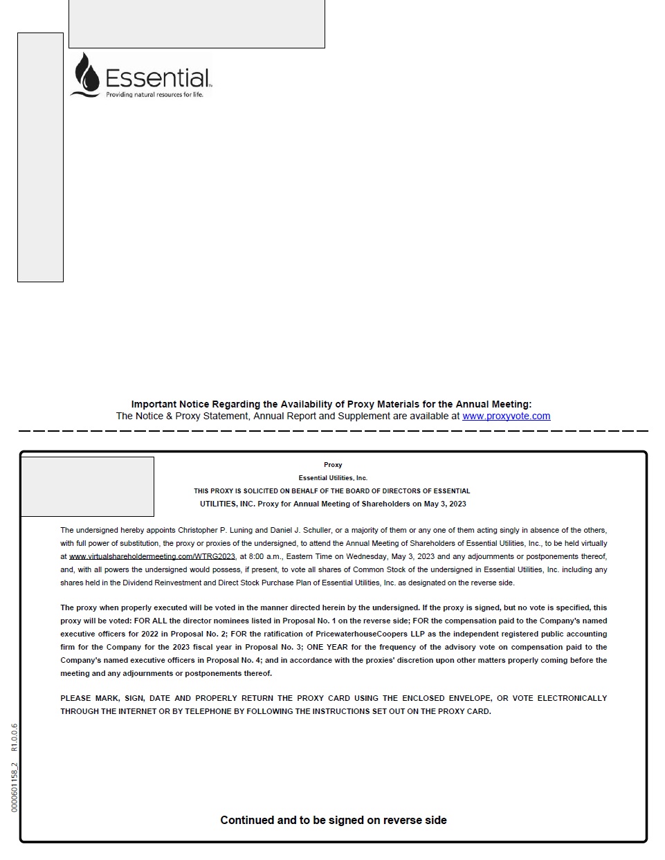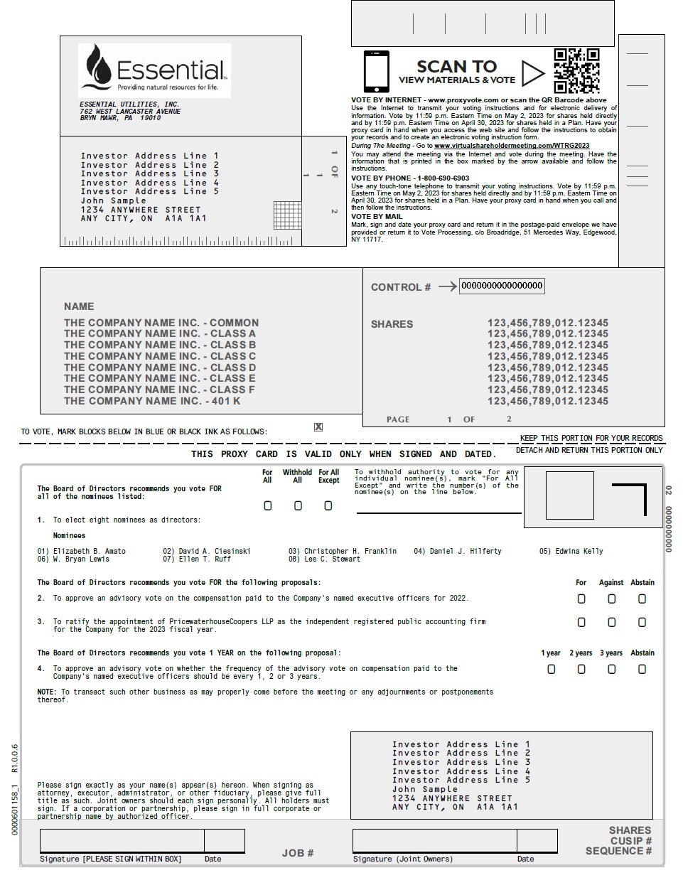 1 1 12345678 12345678 12345678 12345678 12345678 12345678 12345678 12345678 NAME THE COMPANY NAME INC. - COMMON 123,456,789,012.12345 THE COMPANY NAME INC. - CLASS A 123,456,789,012.12345 THE COMPANY NAME INC. - CLASS B 123,456,789,012.12345 THE COMPANY NAME INC. - CLASS C 123,456,789,012.12345 THE COMPANY NAME INC. - CLASS D 123,456,789,012.12345 THE COMPANY NAME INC. - CLASS E 123,456,789,012.12345 THE COMPANY NAME INC. - CLASS F 123,456,789,012.12345 THE COMPANY NAME INC. - 401 K 123,456,789,012.12345 → x 02 0000000000 JOB # 1 OF 2 1 OF 2 PAGE SHARES CUSIP # SEQUENCE # THIS PROXY CARD IS VALID ONLY WHEN SIGNED AND DATED. KEEP THIS PORTION FOR YOUR RECORDS DETACH AND RETURN THIS PORTION ONLY TO VOTE, MARK BLOCKS BELOW IN BLUE OR BLACK INK AS FOLLOWS: Signature [PLEASE SIGN WITHIN BOX] Date Signature (Joint Owners) Date CONTROL # SHARES SCAN TO VIEW MATERIALS & VOTE To withhold authority to vote for any individual nominee(s), mark “For All Except” and write the number(s) of the nominee(s) on the line below. 0 0 0 0 0 0 0 0 0 0 0 0 0 0000601158_1 R1.0.0.6 For Withhold For All All All Except The Board of Directors recommends you vote FOR all of the nominees listed: 1. To elect eight nominees as directors: Nominees 01) Elizabeth B. Amato 02) David A. Ciesinski 03) Christopher H. Franklin 04) Daniel J. Hilferty 05) Edwina Kelly 06) W. Bryan Lewis 07) Ellen T. Ruff 08) Lee C. Stewart ESSENTIAL UTILITIES, INC. 762 WEST LANCASTER AVENUE BRYN MAWR, PA 19010 Investor Address Line 1 Investor Address Line 2 Investor Address Line 3 Investor Address Line 4 Investor Address Line 5 John Sample 1234 ANYWHERE STREET ANY CITY, ON A1A 1A1 Investor Address Line 1 Investor Address Line 2 Investor Address Line 3 Investor Address Line 4 Investor Address Line 5 John Sample 1234 ANYWHERE STREET ANY CITY, ON A1A 1A1 VOTE BY INTERNET - www.proxyvote.com or scan the QR Barcode above Use the Internet to transmit your voting instructions and for electronic delivery of information. Vote by 11:59 p.m. Eastern Time on May 2, 2023 for shares held directly and by 11:59 p.m. Eastern Time on April 30, 2023 for shares held in a Plan. Have your proxy card in hand when you access the web site and follow the instructions to obtain your records and to create an electronic voting instruction form. During The Meeting - Go to www.virtualshareholdermeeting.com/WTRG2023 You may attend the meeting via the Internet and vote during the meeting. Have the information that is printed in the box marked by the arrow available and follow the instructions. VOTE BY PHONE - 1-800-690-6903 Use any touch-tone telephone to transmit your voting instructions. Vote by 11:59 p.m. Eastern Time on May 2, 2023 for shares held directly and by 11:59 p.m. Eastern Time on April 30, 2023 for shares held in a Plan. Have your proxy card in hand when you call and then follow the instructions. VOTE BY MAIL Mark, sign and date your proxy card and return it in the postage-paid envelope we have provided or return it to Vote Processing, c/o Broadridge, 51 Mercedes Way, Edgewood, NY 11717. The Board of Directors recommends you vote FOR the following proposals: For Against Abstain 2. To approve an advisory vote on the compensation paid to the Company's named executive officers for 2022. 3. To ratify the appointment of PricewaterhouseCoopers LLP as the independent registered public accounting firm for the Company for the 2023 fiscal year. The Board of Directors recommends you vote 1 YEAR on the following proposal: 1 year 2 years 3 years Abstain 4. To approve an advisory vote on whether the frequency of the advisory vote on compensation paid to the Company's named executive officers should be every 1, 2 or 3 years. NOTE: To transact such other business as may properly come before the meeting or any adjournments or postponements thereof. Please sign exactly as your name(s) appear(s) hereon. When signing as attorney, executor, administrator, or other fiduciary, please give full title as such. Joint owners should each sign personally. All holders must sign. If a corporation or partnership, please sign in full corporate or partnership name by authorized officer.