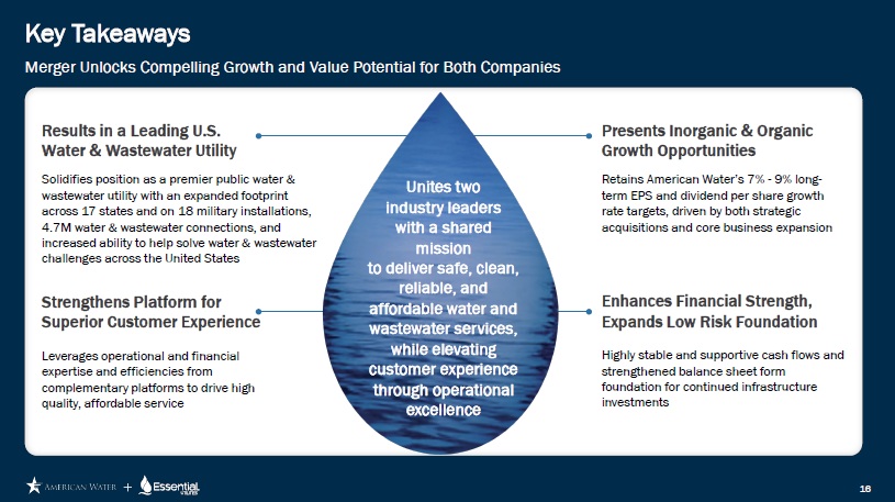 Forward Looking Statements Cautionary Statement Regarding Forward - Looking Statements Certain statements included in this communication are forward - looking statements within the meaning of Section 27A of the Securities Act of 1933, as amended, Section 21E of the Securities Exchange Act of 1934, as amended, and the Private Securities Litigation Reform Act of 1995. In some cases, these forward - looking statements can be identified by words with prospective meanings such as “intend,” “plan,” “estimate,” “believe,” “anticipate,” “expect,” “predict,” “project,” “propose,” “assume,” “forecast,” “outlook,” “future,” “pending,” “goal,” “objective,” “potential,” “continue,” “seek to,” “may,” “can,” “will,” “should” and “could,” or the negative of such terms or other variations or similar expressions. Forward - looking statements may relate to, among other things: statements about the benefits of the proposed merger, including future financial and operating results; the parties’ respective plans, objectives, expectations and intentions; the expected timing and likelihood of completion of the merger and related transactions; the results of any strategic review; expected synergies of the proposed merger; the timing and result of various regulatory proceedings related to the proposed merger, and other general rate cases, filings for infrastructure surcharges and other governmental agency authorizations and proceedings, and filings to address regulatory lag; the combined company’s ability to execute its current and long - term business, operational, capital expenditures and growth plans and strategies; the amount, allocation and timing of projected capital expenditures and related funding requirements; the future impacts of increased or increasing transaction and financing costs associated with the proposed merger or otherwise, as well as inflation and interest rates; each party’s ability to finance current and projected operations, capital expenditure needs and growth initiatives by accessing the debt and equity capital markets and sources of short - term liquidity; impacts of the proposed merger on the future settlement or settlements of a party’s forward sale agreements, including potential adjustments to the forward sale price or other economic terms thereunder, and the amount of and the intended use of net proceeds from any such future settlement or settlements; the outcome and impact on other governmental and regulatory investigations; the filing of class action lawsuits and other litigation and legal proceedings related to the proposed merger; the ability to complete, and the timing and efficacy of, the design, development, implementation and improvement of technology and other strategic initiatives; each party’s ability to comply with new and changing environmental regulations; regulatory, legislative, tax policy or legal developments; and impacts that future significant tax legislation may have on each such party and on its business, results of operations, cash flows and liquidity. These forward - looking statements are predictions based on currently available information, the parties’ current respective expectations and assumptions regarding future events that American Water Works Company, Inc. (“American Water”) and Essential Utilities, Inc. (“Essential Utilities”) believe to be reasonable. They are not, however, guarantees or assurances of any outcomes, performance or achievements, and readers are cautioned not to place undue reliance upon them. You should not regard any forward - looking statement as a representation or warranty by American Water, Essential Utilities or any other person that the expectation, plan or objective expressed in such forward - looking statement will be successfully achieved in any specified time frame, or at all. The forward - looking statements are subject to a number of estimates and assumptions, and known and unknown risks, uncertainties and other factors. Actual results may differ materially from those discussed in the forward - looking statements included in this communication as a result of the factors discussed in American Water’s Annual Report on Form 10 - K for the year ended December 31, 2024, as filed with the Securities and Exchange Commission (the “SEC”) on February 19, 2025 (available at: ir.amwater.com), Essential Utilities’ Annual Report on Form 10 - K for the year ended December 31, 2024, as filed with the SEC on February 27, 2025 (available at: essential.co), and each party’s other filings with the SEC, and additional risks and uncertainties, including with respect to (1) the parties’ ability to consummate the proposed merger pursuant to the terms of the definitive merger agreement or at all; (2) the ability to timely or at all obtain the requisite shareholder approvals with respect to each party; (3) each party’s requirement to obtain required governmental and regulatory approvals required for the proposed merger (and/or that such approvals may result in the imposition of burdensome or commercially undesirable conditions, including required dispositions, that could adversely affect the combined company or the expected benefits of the proposed merger); (4) an event, change or other circumstance that could give rise to the termination of the merger agreement; (5) the failure to satisfy or waive a condition to closing of the proposed merger on a timely basis or at all; (6) a delay in the timing to consummate the proposed merger; (7) the failure to integrate the parties’ businesses successfully; (8) the failure to fully realize cost savings and any other synergies from the proposed merger or that such benefits may take longer to realize than expected; (9) negative or adverse impacts of the announcement of the proposed merger on the market price of American Water’s or Essential Utilities’ common stock; (10) the
