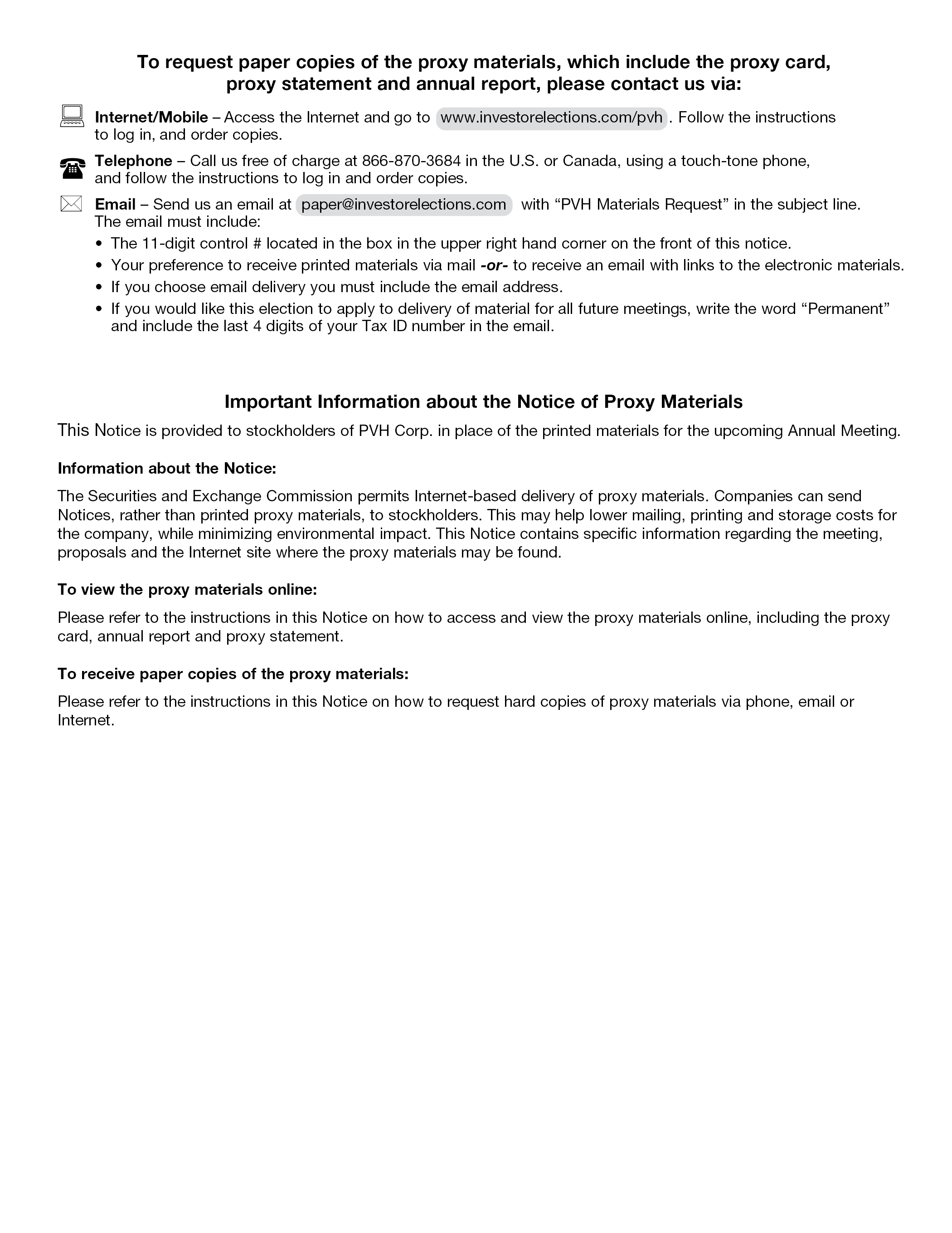 To request paper copies of the proxy materials, which include the proxy card, proxy statement and annual report, please contact us via: Internet/Mobile – Access the Internet and go to www.investorelections.com/pvh . Follow the instructions to log in, and order copies. Telephone – Call us free of charge at 866-870-3684 in the U.S. or Canada, using a touch-tone phone, and follow the instructions to log in and order copies. Email – Send us an email at paper@investorelections.com with “PVH Materials Request” in the subject line. The email must include: • The 11-digit control # located in the box in the upper right hand corner on the front of this notice. • Your preference to receive printed materials via mail -or- to receive an email with links to the electronic materials. • If you choose email delivery you must include the email address. • If you would like this election to apply to delivery of material for all future meetings, write the word “Permanent” and include the last 4 digits of your Tax ID number in the email. Important Information about the Notice of Proxy Materials This Notice is provided to stockholders of PVH Corp. in place of the printed materials for the upcoming Annual Meeting. Information about the Notice: The Securities and Exchange Commission permits Internet-based delivery of proxy materials. Companies can send Notices, rather than printed proxy materials, to stockholders. This may help lower mailing, printing and storage costs for the company, while minimizing environmental impact. This Notice contains specific information regarding the meeting, proposals and the Internet site where the proxy materials may be found. To view the proxy materials online: Please refer to the instructions in this Notice on how to access and view the proxy materials online, including the proxy card, annual report and proxy statement. To receive paper copies of the proxy materials: Please refer to the instructions in this Notice on how to request hard copies of proxy materials via phone, email or Internet.