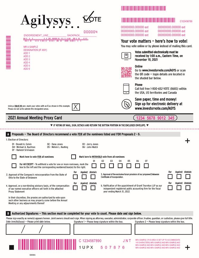 ENDORSEMENT_LINE______________ SACKPACK_____________ MR A SAMPLE DESIGNATION (IF ANY) ADD 1 ADD 2 ADD 3 ADD 4 ADD 5 ADD 6 MMMMMMMMM Using a black ink pen, mark your votes with an X as shown in this example. Please do not write outside the designated areas. MMMMMMMMMMMMMMM C123456789 000000000.000000 ext 000000000.000000 ext 000000000.000000 ext 000000000.000000 ext 000000000.000000 ext 000000000.000000 ext Your vote matters – here’s how to vote! You may vote online or by phone instead of mailing this card. Votes submitted electronicallymust be received by 1:00 a.m., Eastern Time, on November 18, 2021 Online Go to www.investorvote.com/AGYS or scan the QR code — login details are located in the shaded bar below. Phone Call toll free 1-800-652-VOTE (8683) within the USA, US territories and Canada Save paper, time and money! Sign up for electronic delivery at www.investorvote.com/AGYS 2021 Annual Meeting Proxy Card 1234 5678 9012 345 • IF VOTING BY MAIL, SIGN, DETACH AND RETURN THE BOTTOM PORTION IN THE ENCLOSED ENVELOPE. • Proposals — The Board of Directors recommend a vote FOR all the nominees listed and FOR Proposals 2 –5.A 1. Election of Directors: + 01 -Donald A. Colvin 02 -Dana Jones 03 -Jerry Jones 04 -Michael A. Kaufman 05 -Melvin L. Keating 06 -John Mutch 07 -Ramesh Srinivasan Mark here to vote FOR all nominees Mark here to WITHHOLD vote from all nominees 01 02 03 04050607 For All EXCEPT -To withhold a vote for one or more nominees, mark the box to the left and the corresponding numbered box(es) to the right. For Against Abstain For Against Abstain 3. Approval of the exclusive forum provision of our proposed Delaware 2. Approval of the Company’s reincorporation from the State of Certificate of Incorporation. Ohio to the State of Delaware For Against Abstain For Against Abstain 5. Ratification of the appointment of Grant Thornton LLP as our of our named executive officers set forth in the attached 4. Approval, on a non-binding advisory basis, of the compensation independent registered public accounting firm for the fiscal Proxy Statement year ending March 31, 2022 In their discretion, the proxies are authorized to vote upon such other business as may properly come before the Annual Meeting or any adjournments thereof Authorized Signatures — This section must be completed for your vote to count. Please date and sign below. B Pleasesignexactlyasname(s)appears hereon. Joint owners shouldeach sign. When signing as attorney, executor, administrator, corporate officer,trustee, guardian, or custodian, please give fulltitle. Date (mm/dd/yyyy) — Please print date below. Signature 1 — Please keep signature within the box. Signature 2 — Please keep signature within the box. MR A SAMPLE (THIS AREA IS SET UP TO ACCOMMODATE C 1234567890 J N T 140 CHARACTERS) MR A SAMPLE AND MR A SAMPLE AND MR A SAMPLE AND MR A SAMPLE AND MR A SAMPLE AND 1UPX 507876 MR A SAMPLE AND MR A SAMPLE AND MR A SAMPLE AND
