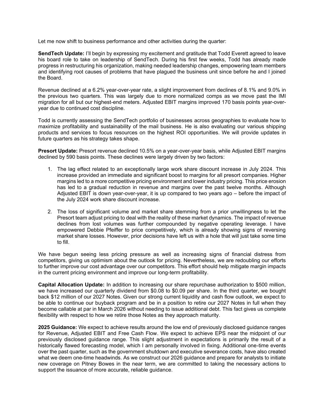 Let me now shift to business performance and other activities during the quarter: SendTech Update: I’ll begin by expressing my excitement and gratitude that Todd Everett agreed to leave his board role to take on leadership of SendTech. During his first few weeks, Todd has already made progress in restructuring his organization, making needed leadership changes, empowering team members and identifying root causes of problems that have plagued the business unit since before he and I joined the Board. Revenue declined at a 6.2% year-over-year rate, a slight improvement from declines of 8.1% and 9.0% in the previous two quarters. This was largely due to more normalized comps as we move past the IMI migration for all but our highest-end meters. Adjusted EBIT margins improved 170 basis points year-over- year due to continued cost discipline. Todd is currently assessing the SendTech portfolio of businesses across geographies to evaluate how to maximize profitability and sustainability of the mail business. He is also evaluating our various shipping products and services to focus resources on the highest ROI opportunities. We will provide updates in future quarters as his strategy takes shape. Presort Update: Presort revenue declined 10.5% on a year-over-year basis, while Adjusted EBIT margins declined by 590 basis points. These declines were largely driven by two factors: 1. The lag effect related to an exceptionally large work share discount increase in July 2024. This increase provided an immediate and significant boost to margins for all presort companies. Higher margins led to a more competitive pricing environment and lower industry pricing. This price erosion has led to a gradual reduction in revenue and margins over the past twelve months. Although Adjusted EBIT is down year-over-year, it is up compared to two years ago – before the impact of the July 2024 work share discount increase. 2. The loss of significant volume and market share stemming from a prior unwillingness to let the Presort team adjust pricing to deal with the reality of these market dynamics. The impact of revenue declines from lost volumes was further compounded by negative operating leverage. I have empowered Debbie Pfeiffer to price competitively, which is already showing signs of reversing market share losses. However, prior decisions have left us with a hole that will just take some time to fill. We have begun seeing less pricing pressure as well as increasing signs of financial distress from competitors, giving us optimism about the outlook for pricing. Nevertheless, we are redoubling our efforts to further improve our cost advantage over our competitors. This effort should help mitigate margin impacts in the current pricing environment and improve our long-term profitability. Capital Allocation Update: In addition to increasing our share repurchase authorization to $500 million, we have increased our quarterly dividend from $0.08 to $0.09 per share. In the third quarter, we bought back $12 million of our 2027 Notes. Given our strong current liquidity and cash flow outlook, we expect to be able to continue our buyback program and be in a position to retire our 2027 Notes in full when they become callable at par in March 2026 without needing to issue additional debt. This fact gives us complete flexibility with respect to how we retire those Notes as they approach maturity. 2025 Guidance: We expect to achieve results around the low end of previously disclosed guidance ranges for Revenue, Adjusted EBIT and Free Cash Flow. We expect to achieve EPS near the midpoint of our previously disclosed guidance range. This slight adjustment in expectations is primarily the result of a historically flawed forecasting model, which I am personally involved in fixing. Additional one-time events over the past quarter, such as the government shutdown and executive severance costs, have also created what we deem one-time headwinds. As we construct our 2026 guidance and prepare for analysts to initiate new coverage on Pitney Bowes in the near term, we are committed to taking the necessary actions to support the issuance of more accurate, reliable guidance.