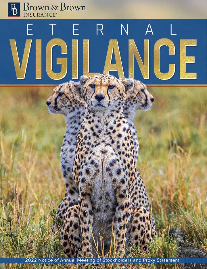 On behalf of Brown & Brown, Inc.’s Board of Directors, we are pleased to invite you to attend our Annual Meeting of Shareholders on Wednesday, May 4, 2022. Again this year, due to the potential travel and community gathering impacts of the coronavirus pandemic (COVID-19), we will hold the meeting virtually via a live audio webcast. The attached Notice of Annual Meeting of Shareholders and Proxy Statement includes important information about the matters to be voted on at the meeting. The proxy materials for the Annual Meeting, which include the Proxy Statement and 2021 Annual Report, are available online to expedite receipt of proxy materials while lowering the costs and reducing the environmental impact of the meeting.