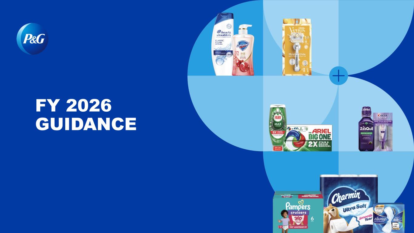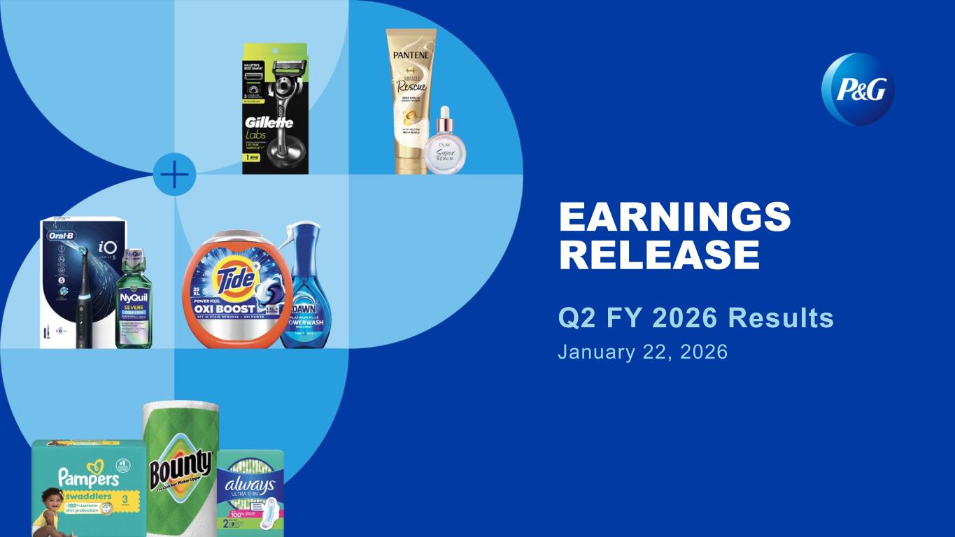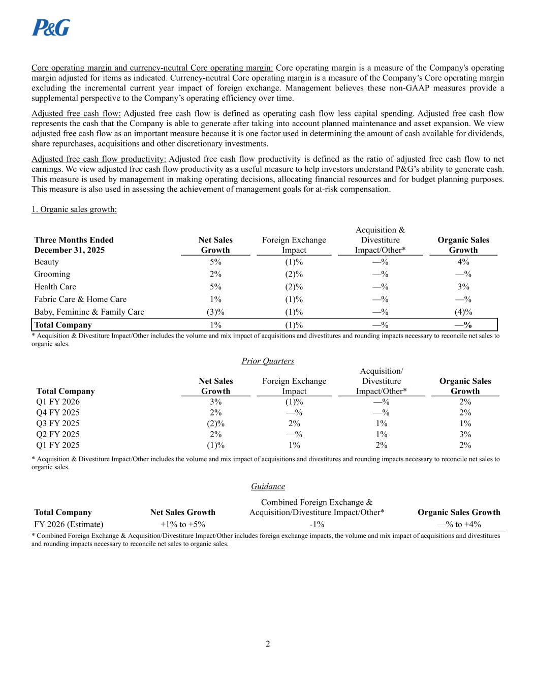 2 Core operating margin and currency-neutral Core operating margin: Core operating margin is a measure of the Company's operating margin adjusted for items as indicated. Currency-neutral Core operating margin is a measure of the Company’s Core operating margin excluding the incremental current year impact of foreign exchange. Management believes these non-GAAP measures provide a supplemental perspective to the Company’s operating efficiency over time. Adjusted free cash flow: Adjusted free cash flow is defined as operating cash flow less capital spending. Adjusted free cash flow represents the cash that the Company is able to generate after taking into account planned maintenance and asset expansion. We view adjusted free cash flow as an important measure because it is one factor used in determining the amount of cash available for dividends, share repurchases, acquisitions and other discretionary investments. Adjusted free cash flow productivity: Adjusted free cash flow productivity is defined as the ratio of adjusted free cash flow to net earnings. We view adjusted free cash flow productivity as a useful measure to help investors understand P&G’s ability to generate cash. This measure is used by management in making operating decisions, allocating financial resources and for budget planning purposes. This measure is also used in assessing the achievement of management goals for at-risk compensation. 1. Organic sales growth: Three Months Ended December 31, 2025 Net Sales Growth Foreign Exchange Impact Acquisition & Divestiture Impact/Other* Organic Sales Growth Beauty 5% (1)% —% 4% Grooming 2% (2)% —% —% Health Care 5% (2)% —% 3% Fabric Care & Home Care 1% (1)% —% —% Baby, Feminine & Family Care (3)% (1)% —% (4)% Total Company 1% (1)% —% —% * Acquisition & Divestiture Impact/Other includes the volume and mix impact of acquisitions and divestitures and rounding impacts necessary to reconcile net sales to organic sales. Prior Quarters Total Company Net Sales Growth Foreign Exchange Impact Acquisition/ Divestiture Impact/Other* Organic Sales Growth Q1 FY 2026 3% (1)% —% 2% Q4 FY 2025 2% —% —% 2% Q3 FY 2025 (2)% 2% 1% 1% Q2 FY 2025 2% —% 1% 3% Q1 FY 2025 (1)% 1% 2% 2% * Acquisition & Divestiture Impact/Other includes the volume and mix impact of acquisitions and divestitures and rounding impacts necessary to reconcile net sales to organic sales. Guidance Total Company Net Sales Growth Combined Foreign Exchange & Acquisition/Divestiture Impact/Other* Organic Sales Growth FY 2026 (Estimate) +1% to +5% -1% —% to +4% * Combined Foreign Exchange & Acquisition/Divestiture Impact/Other includes foreign exchange impacts, the volume and mix impact of acquisitions and divestitures and rounding impacts necessary to reconcile net sales to organic sales.