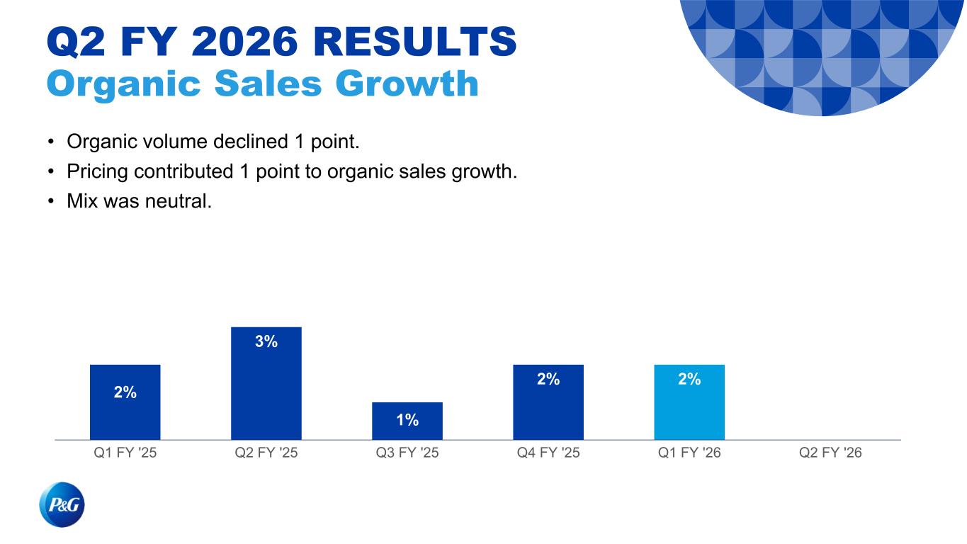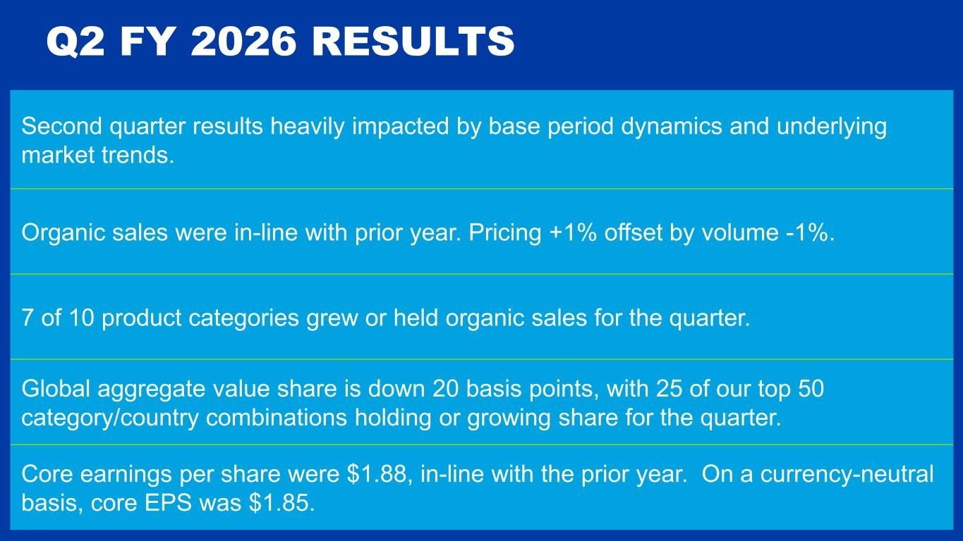 Second quarter results heavily impacted by base period dynamics and underlying market trends. Organic sales were in-line with prior year. Pricing +1% offset by volume -1%. 7 of 10 product categories grew or held organic sales for the quarter. Global aggregate value share is down 20 basis points, with 25 of our top 50 category/country combinations holding or growing share for the quarter. Core earnings per share were $1.88, in-line with the prior year. On a currency-neutral basis, core EPS was $1.85. Q2 FY 2026 RESULTS