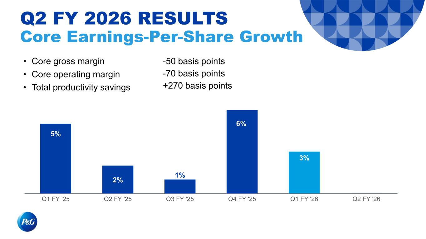• Core gross margin • Core operating margin • Total productivity savings 5% 2% 1% 6% 3% 0%Q1 FY '25 Q2 FY '25 Q3 FY '25 Q4 FY '25 Q1 FY '26 Q2 FY '26 Q2 FY 2026 RESULTS Core Earnings-Per-Share Growth -50 basis points -70 basis points +270 basis points
