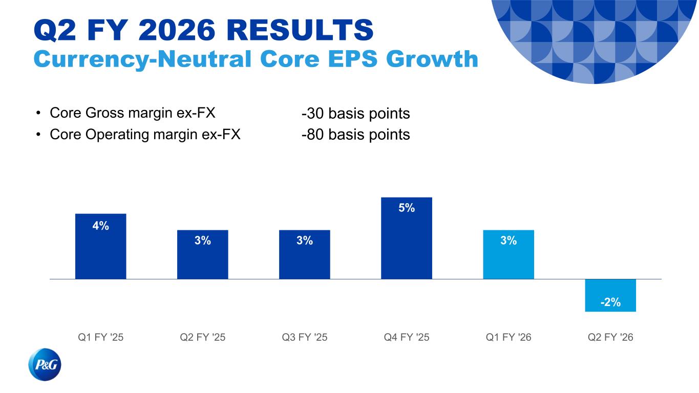 • Core Gross margin ex-FX • Core Operating margin ex-FX -30 basis points -80 basis points 4% 3% 3% 5% 3% -2% Q1 FY '25 Q2 FY '25 Q3 FY '25 Q4 FY '25 Q1 FY '26 Q2 FY '26 Q2 FY 2026 RESULTS Currency-Neutral Core EPS Growth