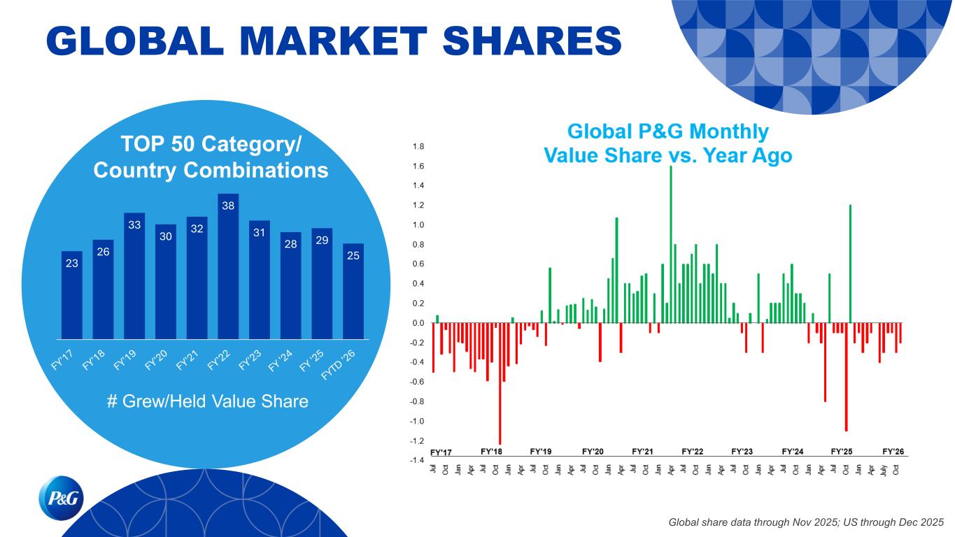 TOP 50 Category/ Country Combinations # Grew/Held Value Share 23 26 33 30 32 38 31 28 29 25 Global share data through Nov 2025; US through Dec 2025 GLOBAL MARKET SHARES
