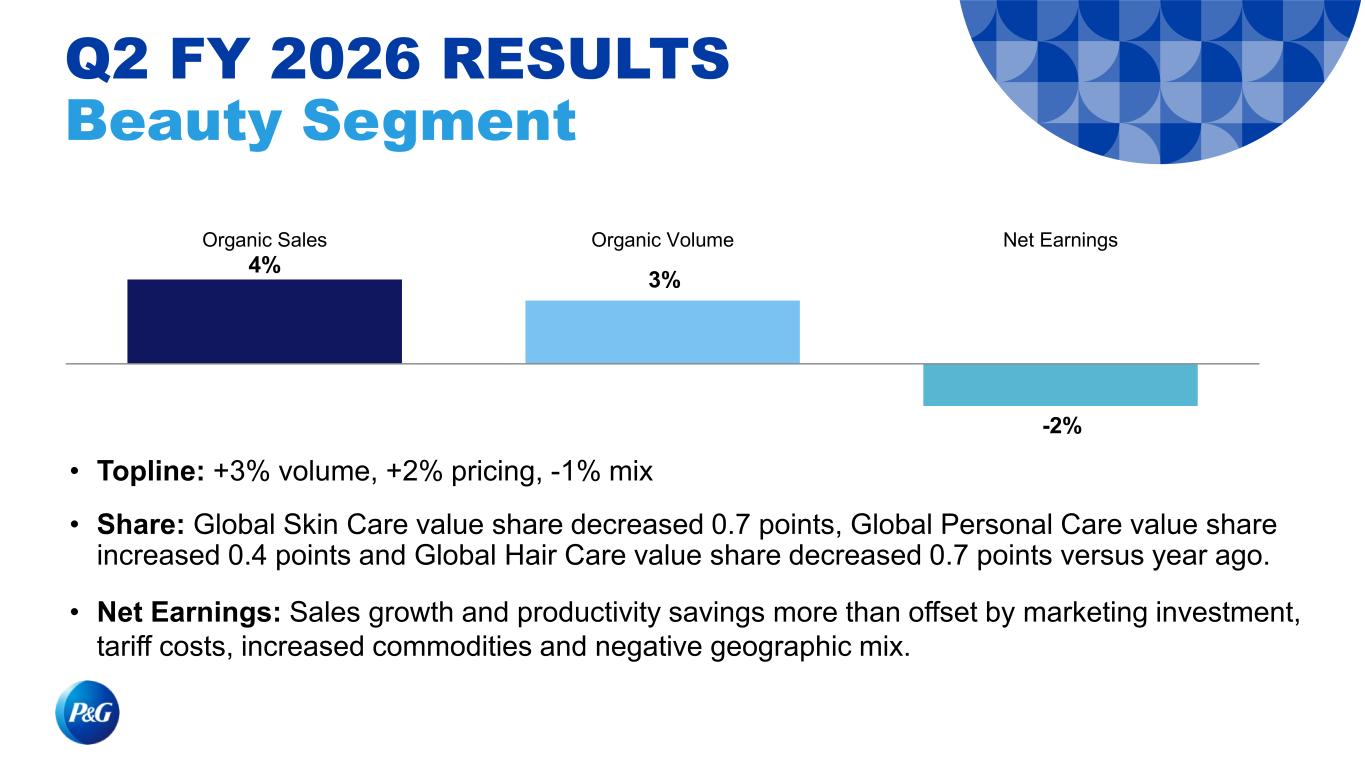 4% 3% -2% Organic Sales Organic Volume Net Earnings • Topline: +3% volume, +2% pricing, -1% mix • Share: Global Skin Care value share decreased 0.7 points, Global Personal Care value share increased 0.4 points and Global Hair Care value share decreased 0.7 points versus year ago. • Net Earnings: Sales growth and productivity savings more than offset by marketing investment, tariff costs, increased commodities and negative geographic mix. Q2 FY 2026 RESULTS Beauty Segment