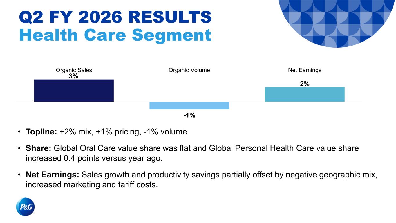 3% -1% 2% Organic Sales Organic Volume Net Earnings Q2 FY 2026 RESULTS Health Care Segment • Topline: +2% mix, +1% pricing, -1% volume • Share: Global Oral Care value share was flat and Global Personal Health Care value share increased 0.4 points versus year ago. • Net Earnings: Sales growth and productivity savings partially offset by negative geographic mix, increased marketing and tariff costs.