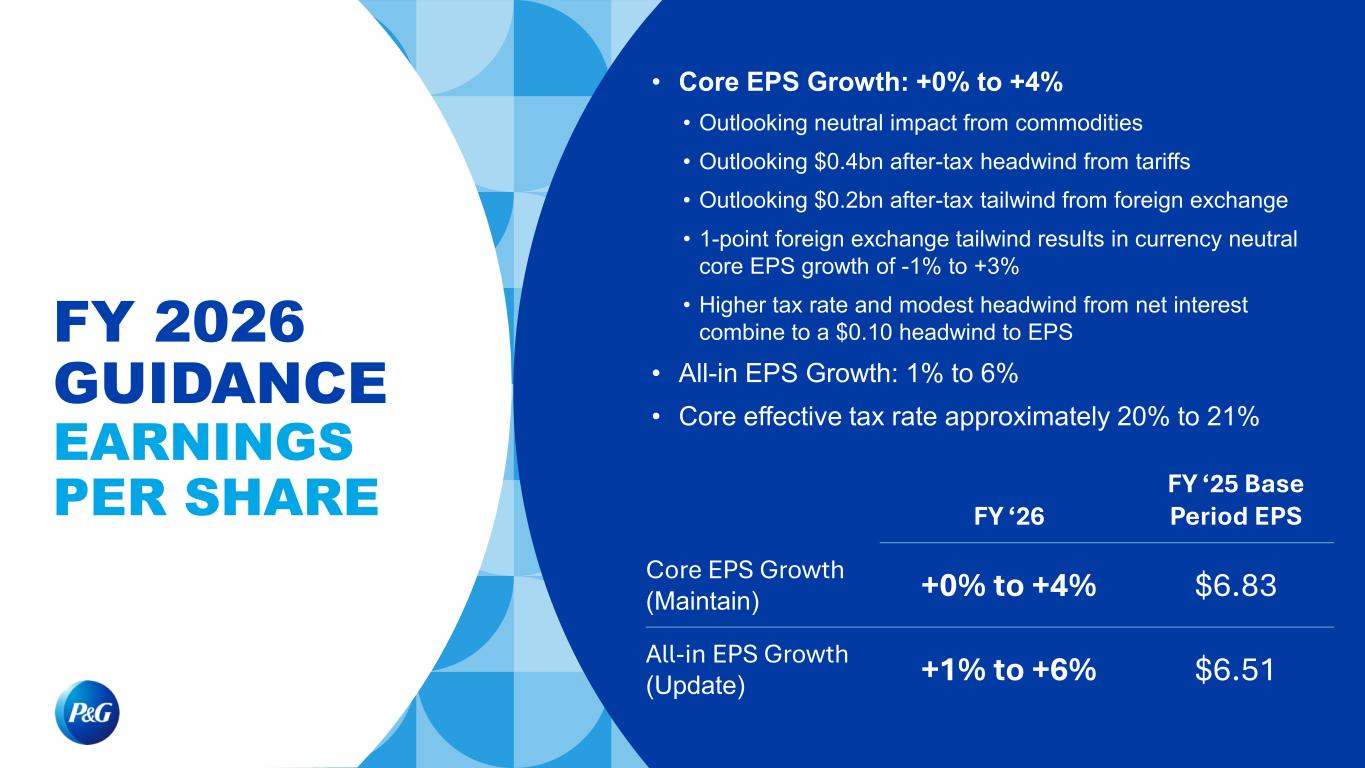FY 2026 GUIDANCE EARNINGS PER SHARE • Core EPS Growth: +0% to +4% • Outlooking neutral impact from commodities • Outlooking $0.4bn after-tax headwind from tariffs • Outlooking $0.2bn after-tax tailwind from foreign exchange • 1-point foreign exchange tailwind results in currency neutral core EPS growth of -1% to +3% • Higher tax rate and modest headwind from net interest combine to a $0.10 headwind to EPS • All-in EPS Growth: 1% to 6% • Core effective tax rate approximately 20% to 21% FY ‘26 FY ‘25 Base Period EPS Core EPS Growth (Maintain) +0% to +4% $6.83 All-in EPS Growth (Update) +1% to +6% $6.51