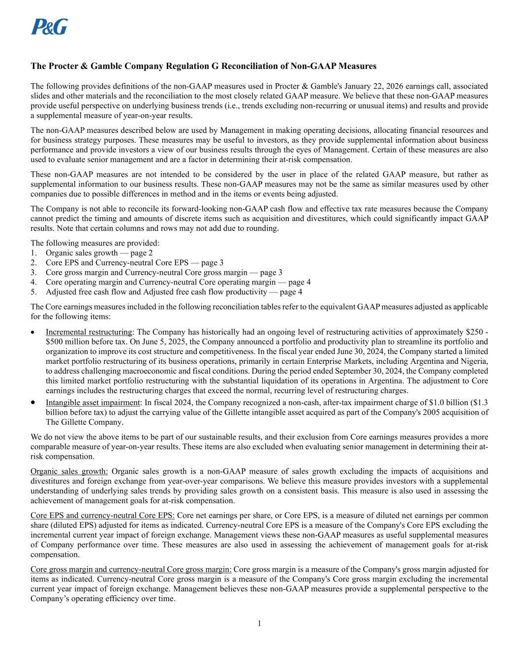 1 The Procter & Gamble Company Regulation G Reconciliation of Non-GAAP Measures The following provides definitions of the non-GAAP measures used in Procter & Gamble's January 22, 2026 earnings call, associated slides and other materials and the reconciliation to the most closely related GAAP measure. We believe that these non-GAAP measures provide useful perspective on underlying business trends (i.e., trends excluding non-recurring or unusual items) and results and provide a supplemental measure of year-on-year results. The non-GAAP measures described below are used by Management in making operating decisions, allocating financial resources and for business strategy purposes. These measures may be useful to investors, as they provide supplemental information about business performance and provide investors a view of our business results through the eyes of Management. Certain of these measures are also used to evaluate senior management and are a factor in determining their at-risk compensation. These non-GAAP measures are not intended to be considered by the user in place of the related GAAP measure, but rather as supplemental information to our business results. These non-GAAP measures may not be the same as similar measures used by other companies due to possible differences in method and in the items or events being adjusted. The Company is not able to reconcile its forward-looking non-GAAP cash flow and effective tax rate measures because the Company cannot predict the timing and amounts of discrete items such as acquisition and divestitures, which could significantly impact GAAP results. Note that certain columns and rows may not add due to rounding. The following measures are provided: 1. Organic sales growth — page 2 2. Core EPS and Currency-neutral Core EPS — page 3 3. Core gross margin and Currency-neutral Core gross margin — page 3 4. Core operating margin and Currency-neutral Core operating margin — page 4 5. Adjusted free cash flow and Adjusted free cash flow productivity — page 4 The Core earnings measures included in the following reconciliation tables refer to the equivalent GAAP measures adjusted as applicable for the following items: Incremental restructuring: The Company has historically had an ongoing level of restructuring activities of approximately $250 - $500 million before tax. On June 5, 2025, the Company announced a portfolio and productivity plan to streamline its portfolio and organization to improve its cost structure and competitiveness. In the fiscal year ended June 30, 2024, the Company started a limited market portfolio restructuring of its business operations, primarily in certain Enterprise Markets, including Argentina and Nigeria, to address challenging macroeconomic and fiscal conditions. During the period ended September 30, 2024, the Company completed this limited market portfolio restructuring with the substantial liquidation of its operations in Argentina. The adjustment to Core earnings includes the restructuring charges that exceed the normal, recurring level of restructuring charges. Intangible asset impairment: In fiscal 2024, the Company recognized a non-cash, after-tax impairment charge of $1.0 billion ($1.3 billion before tax) to adjust the carrying value of the Gillette intangible asset acquired as part of the Company's 2005 acquisition of The Gillette Company. We do not view the above items to be part of our sustainable results, and their exclusion from Core earnings measures provides a more comparable measure of year-on-year results. These items are also excluded when evaluating senior management in determining their at- risk compensation. Organic sales growth: Organic sales growth is a non-GAAP measure of sales growth excluding the impacts of acquisitions and divestitures and foreign exchange from year-over-year comparisons. We believe this measure provides investors with a supplemental understanding of underlying sales trends by providing sales growth on a consistent basis. This measure is also used in assessing the achievement of management goals for at-risk compensation. Core EPS and currency-neutral Core EPS: Core net earnings per share, or Core EPS, is a measure of diluted net earnings per common share (diluted EPS) adjusted for items as indicated. Currency-neutral Core EPS is a measure of the Company's Core EPS excluding the incremental current year impact of foreign exchange. Management views these non-GAAP measures as useful supplemental measures of Company performance over time. These measures are also used in assessing the achievement of management goals for at-risk compensation. Core gross margin and currency-neutral Core gross margin: Core gross margin is a measure of the Company's gross margin adjusted for items as indicated. Currency-neutral Core gross margin is a measure of the Company's Core gross margin excluding the incremental current year impact of foreign exchange. Management believes these non-GAAP measures provide a supplemental perspective to the Company’s operating efficiency over time.