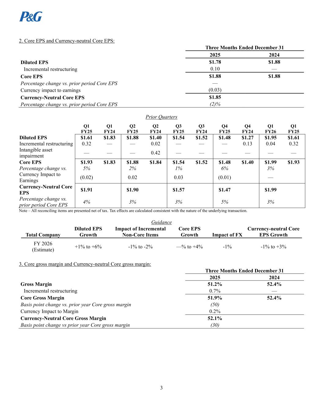 3 2. Core EPS and Currency-neutral Core EPS: Three Months Ended December 31 2025 2024 Diluted EPS $1.78 $1.88 Incremental restructuring 0.10 — Core EPS $1.88 $1.88 Percentage change vs. prior period Core EPS — Currency impact to earnings (0.03) Currency-Neutral Core EPS $1.85 Percentage change vs. prior period Core EPS (2)% Prior Quarters Note – All reconciling items are presented net of tax. Tax effects are calculated consistent with the nature of the underlying transaction. Guidance Total Company Diluted EPS Growth Impact of Incremental Non-Core Items Core EPS Growth Impact of FX Currency-neutral Core EPS Growth FY 2026 (Estimate) +1% to +6% -1% to -2% —% to +4% -1% -1% to +3% 3. Core gross margin and Currency-neutral Core gross margin: Three Months Ended December 31 2025 2024 Gross Margin 51.2% 52.4% Incremental restructuring 0.7% — Core Gross Margin 51.9% 52.4% Basis point change vs. prior year Core gross margin (50) Currency Impact to Margin 0.2% Currency-Neutral Core Gross Margin 52.1% Basis point change vs prior year Core gross margin (30) Q1 FY25 Q1 FY24 Q2 FY25 Q2 FY24 Q3 FY25 Q3 FY24 Q4 FY25 Q4 FY24 Q1 FY26 Q1 FY25 Diluted EPS $1.61 $1.83 $1.88 $1.40 $1.54 $1.52 $1.48 $1.27 $1.95 $1.61 Incremental restructuring 0.32 — — 0.02 — — — 0.13 0.04 0.32 Intangible asset impairment — — — 0.42 — — — — — — Core EPS $1.93 $1.83 $1.88 $1.84 $1.54 $1.52 $1.48 $1.40 $1.99 $1.93 Percentage change vs. 5% 2% 1% 6% 3% Currency Impact to Earnings (0.02) 0.02 0.03 (0.01) — Currency-Neutral Core EPS $1.91 $1.90 $1.57 $1.47 $1.99 Percentage change vs. prior period Core EPS 4% 3% 3% 5% 3%
