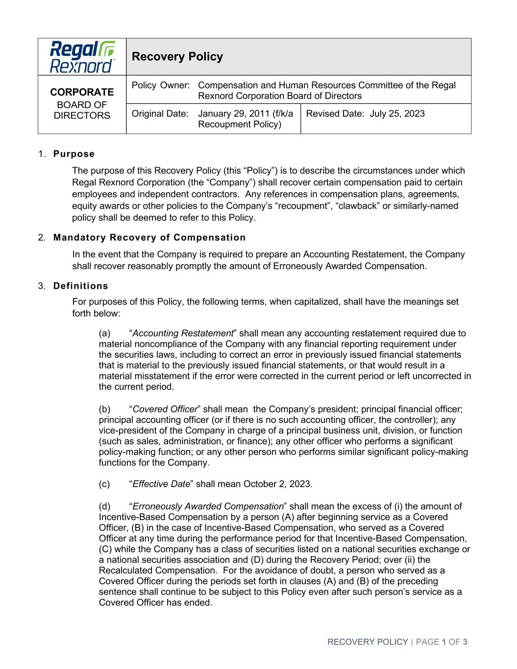 RECOVERY POLICY | PAGE 1 OF 3 Recovery Policy CORPORATE BOARD OF DIRECTORS Policy Owner: Compensation and Human Resources Committee of the Regal Rexnord Corporation Board of Directors Original Date: January 29, 2011 (f/k/a Recoupment Policy) Revised Date: July 25, 2023 1. Purpose The purpose of this Recovery Policy (this “Policy”) is to describe the circumstances under which Regal Rexnord Corporation (the “Company”) shall recover certain compensation paid to certain employees and independent contractors. Any references in compensation plans, agreements, equity awards or other policies to the Company’s “recoupment”, “clawback” or similarly-named policy shall be deemed to refer to this Policy. 2. Mandatory Recovery of Compensation In the event that the Company is required to prepare an Accounting Restatement, the Company shall recover reasonably promptly the amount of Erroneously Awarded Compensation. 3. Definitions For purposes of this Policy, the following terms, when capitalized, shall have the meanings set forth below: (a) “Accounting Restatement” shall mean any accounting restatement required due to material noncompliance of the Company with any financial reporting requirement under the securities laws, including to correct an error in previously issued financial statements that is material to the previously issued financial statements, or that would result in a material misstatement if the error were corrected in the current period or left uncorrected in the current period. (b) “Covered Officer” shall mean the Company’s president; principal financial officer; principal accounting officer (or if there is no such accounting officer, the controller); any vice-president of the Company in charge of a principal business unit, division, or function (such as sales, administration, or finance); any other officer who performs a significant policy-making function; or any other person who performs similar significant policy-making functions for the Company. (c) “Effective Date” shall mean October 2, 2023. (d) “Erroneously Awarded Compensation” shall mean the excess of (i) the amount of Incentive-Based Compensation by a person (A) after beginning service as a Covered Officer, (B) in the case of Incentive-Based Compensation, who served as a Covered Officer at any time during the performance period for that Incentive-Based Compensation, (C) while the Company has a class of securities listed on a national securities exchange or a national securities association and (D) during the Recovery Period; over (ii) the Recalculated Compensation. For the avoidance of doubt, a person who served as a Covered Officer during the periods set forth in clauses (A) and (B) of the preceding sentence shall continue to be subject to this Policy even after such person’s service as a Covered Officer has ended.