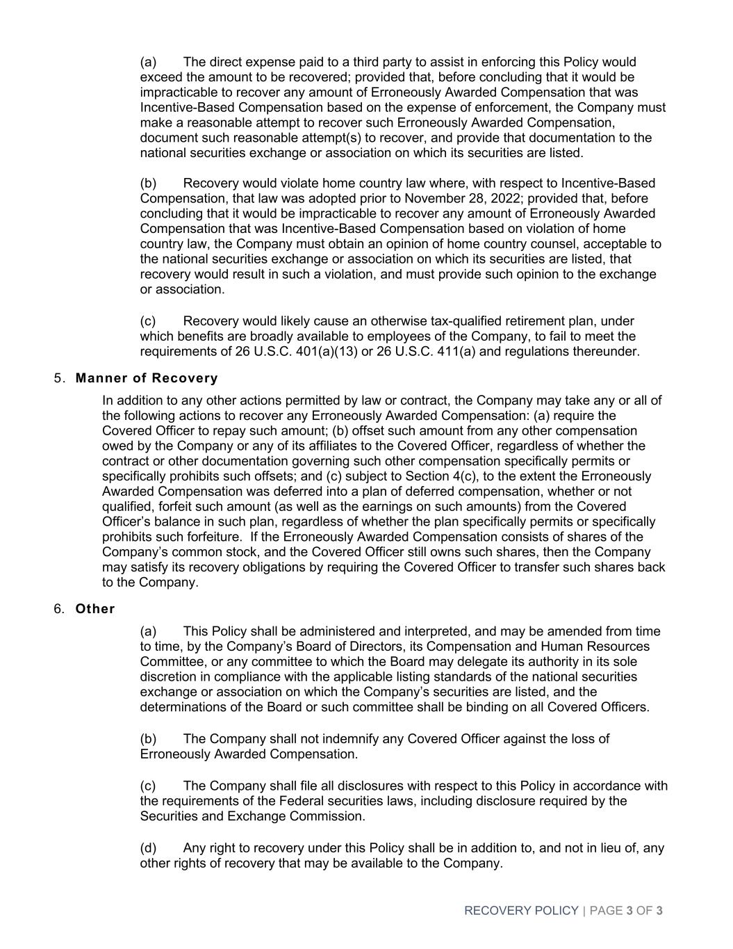 RECOVERY POLICY | PAGE 3 OF 3 (a) The direct expense paid to a third party to assist in enforcing this Policy would exceed the amount to be recovered; provided that, before concluding that it would be impracticable to recover any amount of Erroneously Awarded Compensation that was Incentive-Based Compensation based on the expense of enforcement, the Company must make a reasonable attempt to recover such Erroneously Awarded Compensation, document such reasonable attempt(s) to recover, and provide that documentation to the national securities exchange or association on which its securities are listed. (b) Recovery would violate home country law where, with respect to Incentive-Based Compensation, that law was adopted prior to November 28, 2022; provided that, before concluding that it would be impracticable to recover any amount of Erroneously Awarded Compensation that was Incentive-Based Compensation based on violation of home country law, the Company must obtain an opinion of home country counsel, acceptable to the national securities exchange or association on which its securities are listed, that recovery would result in such a violation, and must provide such opinion to the exchange or association. (c) Recovery would likely cause an otherwise tax-qualified retirement plan, under which benefits are broadly available to employees of the Company, to fail to meet the requirements of 26 U.S.C. 401(a)(13) or 26 U.S.C. 411(a) and regulations thereunder. 5. Manner of Recovery In addition to any other actions permitted by law or contract, the Company may take any or all of the following actions to recover any Erroneously Awarded Compensation: (a) require the Covered Officer to repay such amount; (b) offset such amount from any other compensation owed by the Company or any of its affiliates to the Covered Officer, regardless of whether the contract or other documentation governing such other compensation specifically permits or specifically prohibits such offsets; and (c) subject to Section 4(c), to the extent the Erroneously Awarded Compensation was deferred into a plan of deferred compensation, whether or not qualified, forfeit such amount (as well as the earnings on such amounts) from the Covered Officer’s balance in such plan, regardless of whether the plan specifically permits or specifically prohibits such forfeiture. If the Erroneously Awarded Compensation consists of shares of the Company’s common stock, and the Covered Officer still owns such shares, then the Company may satisfy its recovery obligations by requiring the Covered Officer to transfer such shares back to the Company. 6. Other (a) This Policy shall be administered and interpreted, and may be amended from time to time, by the Company’s Board of Directors, its Compensation and Human Resources Committee, or any committee to which the Board may delegate its authority in its sole discretion in compliance with the applicable listing standards of the national securities exchange or association on which the Company’s securities are listed, and the determinations of the Board or such committee shall be binding on all Covered Officers. (b) The Company shall not indemnify any Covered Officer against the loss of Erroneously Awarded Compensation. (c) The Company shall file all disclosures with respect to this Policy in accordance with the requirements of the Federal securities laws, including disclosure required by the Securities and Exchange Commission. (d) Any right to recovery under this Policy shall be in addition to, and not in lieu of, any other rights of recovery that may be available to the Company.
