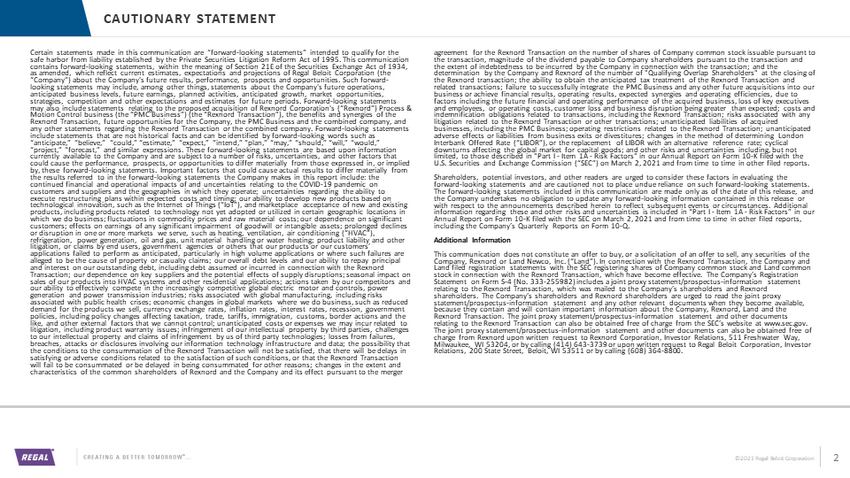 ©2021 Regal Beloit Corporation CAUTIONARY STATEMENT 2 Certain statements made in this communication are “forward - looking statements” intended to qualify for the safe harbor from liability established by the Private Securities Litigation Reform Act of 1995. This communication contains forward - looking statements, within the meaning of Section 21E of the Securities Exchange Act of 1934, as amended, which reflect current estimates, expectations and projections of Regal Beloit Corporation (the “Company”) about the Company's future results, performance, prospects and opportunities. Such forward - looking statements may include, among other things, statements about the Company's future operations, anticipated business levels, future earnings, planned activities, anticipated growth, market opportunities, strategies, competition and other expectations and estimates for future periods. Forward - looking statements may also include statements relating to the proposed acquisition of Rexnord Corporation's (“Rexnord”) Process & Motion Control business (the “PMC Business”) (the “Rexnord Transaction”), the benefits and synergies of the Rexnord Transaction, future opportunities for the Company, the PMC Business and the combined company, and any other statements regarding the Rexnord Transaction or the combined company. Forward - looking statements include statements that are not historical facts and can be identified by forward - looking words such as “anticipate,” “believe,” “could,” “estimate,” “expect,” “intend,” “plan,” “may,” “should,” “will,” “would,” “project,” “forecast,” and similar expressions. These forward - looking statements are based upon information currently available to the Company and are subject to a number of risks, uncertainties, and other factors that could cause the performance, prospects, or opportunities to differ materially from those expressed in, or implied by, these forward - looking statements. Important factors that could cause actual results to differ materially from the results referred to in the forward - looking statements the Company makes in this report include: the continued financial and operational impacts of and uncertainties relating to the COVID - 19 pandemic on customers and suppliers and the geographies in which they operate; uncertainties regarding the ability to execute restructuring plans within expected costs and timing; our ability to develop new products based on technological innovation, such as the Internet of Things (“IoT”), and marketplace acceptance of new and existing products, including products related to technology not yet adopted or utilized in certain geographic locations in which we do business; fluctuations in commodity prices and raw material costs; our dependence on significant customers; effects on earnings of any significant impairment of goodwill or intangible assets; prolonged declines or disruption in one or more markets we serve, such as heating, ventilation, air conditioning (“HVAC”), refrigeration, power generation, oil and gas, unit material handling or water heating; product liability and other litigation, or claims by end users, government agencies or others that our products or our customers’ applications failed to perform as anticipated, particularly in high volume applications or where such failures are alleged to be the cause of property or casualty claims; our overall debt levels and our ability to repay principal and interest on our outstanding debt, including debt assumed or incurred in connection with the Rexnord Transaction; our dependence on key suppliers and the potential effects of supply disruptions; seasonal impact on sales of our products into HVAC systems and other residential applications; actions taken by our competitors and our ability to effectively compete in the increasingly competitive global electric motor and controls, power generation and power transmission industries; risks associated with global manufacturing, including risks associated with public health crises; economic changes in global markets where we do business, such as reduced demand for the products we sell, currency exchange rates, inflation rates, interest rates, recession, government policies, including policy changes affecting taxation, trade, tariffs, immigration, customs, border actions and the like, and other external factors that we cannot control; unanticipated costs or expenses we may incur related to litigation, including product warranty issues; infringement of our intellectual property by third parties, challenges to our intellectual property and claims of infringement by us of third party technologies; losses from failures, breaches, attacks or disclosures involving our information technology infrastructure and data; the possibility that the conditions to the consummation of the Rexnord Transaction will not be satisfied, that there will be delays in satisfying or adverse conditions related to the satisfaction of such conditions, or that the Rexnord Transaction will fail to be consummated or be delayed in being consummated for other reasons; changes in the extent and characteristics of the common shareholders of Rexnord and the Company and its effect pursuant to the merger agreement for the Rexnord Transaction on the number of shares of Company common stock issuable pursuant to the transaction, magnitude of the dividend payable to Company shareholders pursuant to the transaction and the extent of indebtedness to be incurred by the Company in connection with the transaction; and the determination by the Company and Rexnord of the number of "Qualifying Overlap Shareholders" at the closing of the Rexnord transaction; the ability to obtain the anticipated tax treatment of the Rexnord Transaction and related transactions; failure to successfully integrate the PMC Business and any other future acquisitions into our business or achieve financial resu