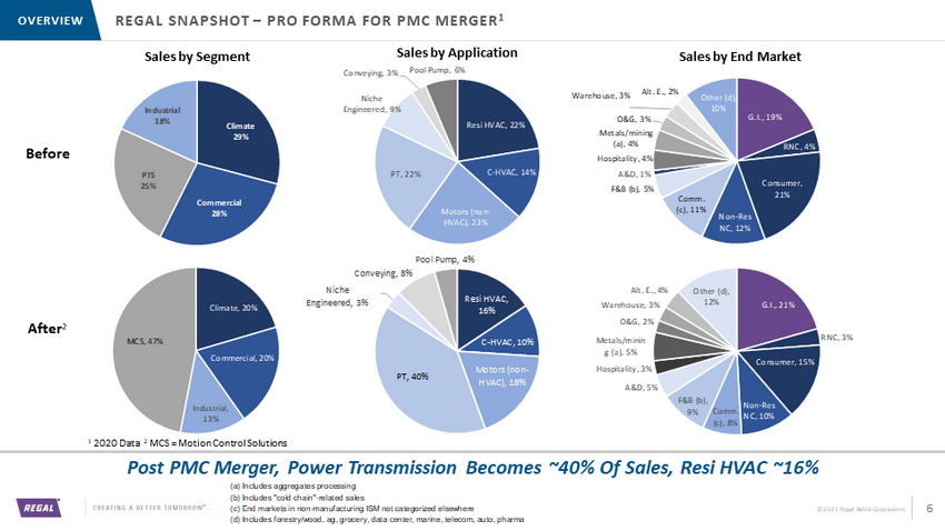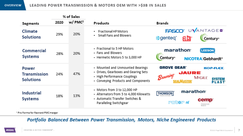 ©2021 Regal Beloit Corporation Resi HVAC , 22% C - HVAC , 14% Motors (non - HVAC) , 23% PT , 22% Niche Engineered , 9% Conveying , 3% Pool Pump , 6% REGAL SNAPSHOT – PRO FORMA FOR PMC MERGER 1 OVERVIEW Post PMC Merger, Power Transmission Becomes ~40% Of Sales, Resi HVAC ~16% 6 Sales by Application Sales by End Market Sales by Segment Climate 29% Commercial 28% PTS 25% Industrial 18% 1 2020 Data 2 MCS = Motion Control Solutions 9% Resi HVAC , 16% C - HVAC , 10% Motors (non - HVAC) , 18% PT , 40% Niche Engineered , 3% Conveying , 8% Pool Pump , 4% Climate , 20% Commercial , 20% Industrial , 13% MCS , 47% Before After 2 (a) Includes aggregates processing (b) Includes "cold chain"-related sales (c) End markets in non-manufacturing ISM not categorized elsewhere (d) Includes forestry/wood, ag, grocery, data center, marine, telecom, auto, pharma G.I. , 19% RNC , 4% Consumer , 21% Non - Res NC , 12% Comm. (c) , 11% F&B (b) , 5% A&D , 1% Hospitality , 4% Metals/mining (a) , 4% O&G , 3% Warehouse , 3% Alt. E. , 2% Other (d) , 10% G.I. , 21% RNC , 3% Consumer , 15% Non - Res NC , 10% Comm. (c) , 8% F&B (b) , 9% A&D , 5% Hospitality , 3% Metals/minin g (a) , 5% O&G , 2% Warehouse , 3% Alt. E. , 4% Other (d) , 12%