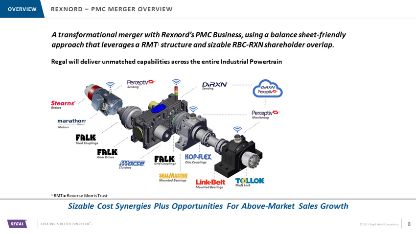 ©2021 Regal Beloit Corporation Portfolio Balanced Between Power Transmission, Motors, Niche Engineered Products LEADING POWER TRANSMISSION & MOTORS OEM WITH >$3B IN SALES OVERVIEW 7 • Fractional HP Motors • Small Fans and Blowers • Fractional to 5 HP Motors • Fans and Blowers • Hermetic Motors 5 to 3,000 HP • Mounted and Unmounted Bearings • Drives, Gearboxes and Gearing Sets • High Performance Couplings • Conveying Products and Components • Motors from 3 to 12,000 HP • Alternators from 5 to 4,000 Kilowatts • Automatic Transfer Switches & Paralleling Switchgear % of Sales Products Brands Climate Solutions 29% Commercial Systems 28% Power Transmission Solutions 24% Industrial Systems 18% 2020 w/ PMC 1 1 Pro Forma for Rexnord PMC merger 20% 20% 47% 13% Segments