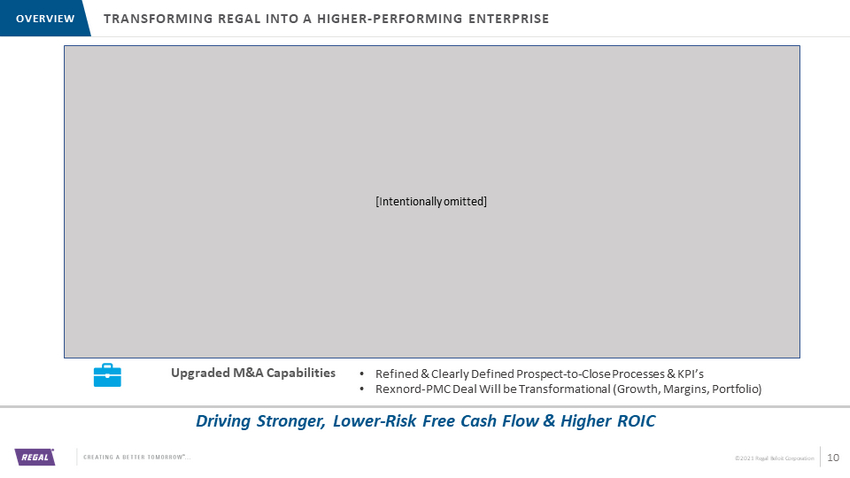 ©2021 Regal Beloit Corporation Driving Stronger, Lower - Risk Free Cash Flow & Higher ROIC TRANSFORMING REGAL INTO A HIGHER - PERFORMING ENTERPRISE OVERVIEW Decentralized Launched 80/20 Consolidating Resources Infusing New Leadership 10 Raised Transparency • Moved From 3 Segment P&L’s to 22 BU and >60 Plant - level & Key Product P&L’s • Allows Leaders to Manage with Greater Precision…and Urgency Implementing RBS - Lean Planting Growth Seeds Upgraded M&A Capabilities • Operating Control Closer to Customers & Channel Partners, Improving VOC • Focusing Resources on Highest - Return Growth Opportunities • Cutting SKUs by ~40% • Human Capital Management Now a Top Strategic Priority • >50% of Regal’s 22 Business Unit (“BU”) Leaders Are New Since 2019 • Reducing Manufacturing Footprint by ~25% (2018 to 2022) • ESG is a Strategic Growth Driver • Detailed Product Road Maps, Defined by VOC, at Each of 22 BU’s • Raising RD&E Spend by $30 Million (~1% % Sales) by 2022 • Digital Investments Enable Data Analytics Solutions & Enhance Service Levels • Removing Waste, Overburden and Variance from All Processes • Every Plant Will Have an Experienced Lean Leader • Refined & Clearly Defined Prospect - to - Close Processes & KPI’s • Rexnord - PMC Deal Will be Transformational (Growth, Margins, Portfolio) [Intentionally omitted]