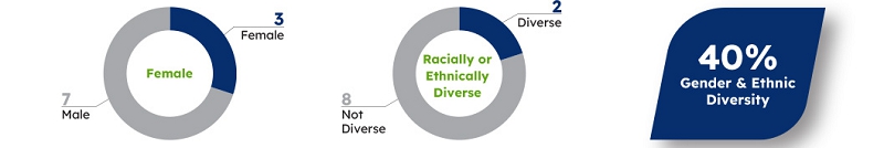 Diverse board, with three female directors and two directors who are racially or ethnically diverse |