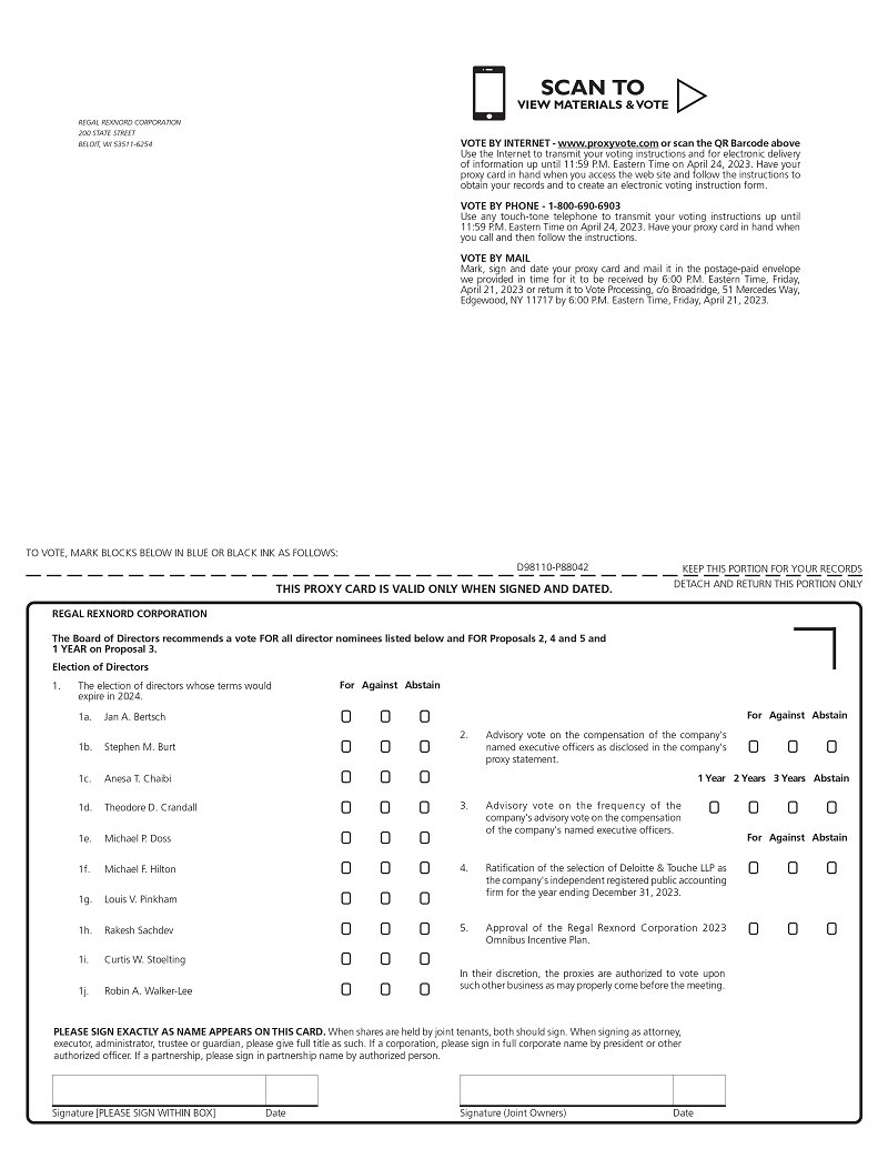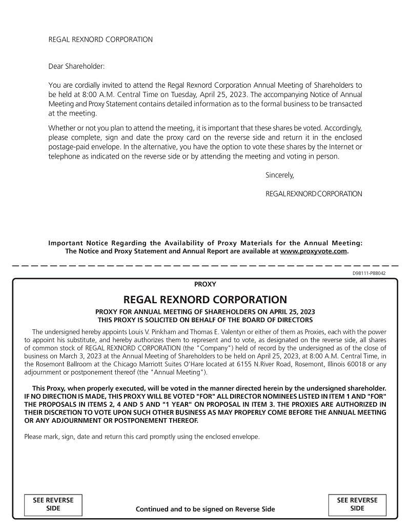 Dear fellow Regal Rexnord shareholder, I am pleased to invite you to our Annual Meeting of Shareholders, which will be held on Tuesday, April 25, 2023 at 8:00 a.m. local time in the Rosemont Ballroom at the Chicago Marriott Suites O’Hare, located at 6155 N. River Road, Rosemont, Illinois 60018. At this year’s meeting you will be asked to vote on the five proposals listed in the enclosed Notice of Annual Meeting. Please take the time to review the information on each of the proposals contained inside the Proxy Statement. The Board of Directors recommends that you vote FOR each of the proposals. On behalf of management and our Board of Directors, I want to thank you for your continued support and confidence. In 2022, Regal Rexnord delivered another year of exceptional performance despite challenging market conditions, including 37% sales growth and 380 basis points of margin expansion. Notably, we also announced our highly-strategic decision to acquire Altra Industrial Motion Corp. We believe that the addition of Altra to the Regal Rexnord portfolio will accelerate our ongoing transformation into a faster-growing, higher-margin, more cash generative, and higher-return enterprise. In 2022, we refreshed the Board of Directors, welcoming Michael Doss, the current President and Chief Executive Officer of Graphic Packaging Holding Company, a public company that is a leader in the design and manufacturing of packaging for consumer products. We are excited for the fresh perspective that Mr. Doss will bring to our Board of Directors. At the Annual Meeting this year, Christopher Doerr will retire from our Board of Directors. We thank him for his valuable service to the Company, and wish him the very best in his future endeavors. Last year over 95% of all eligible votes were cast by shareholders at the Annual Meeting, once again demonstrating the strong engagement and commitment of our shareholders to Regal Rexnord. I encourage you to cast your vote and to continue your support of Regal Rexnord. It is truly an exciting time at Regal Rexnord, and your engagement plays an integral role helping to guide and advance our journey to accelerating profitable growth. On behalf of our Board of Directors and the entire Company, we thank you for your share ownership in Regal Rexnord and look forward to seeing you at the meeting. Very truly yours,