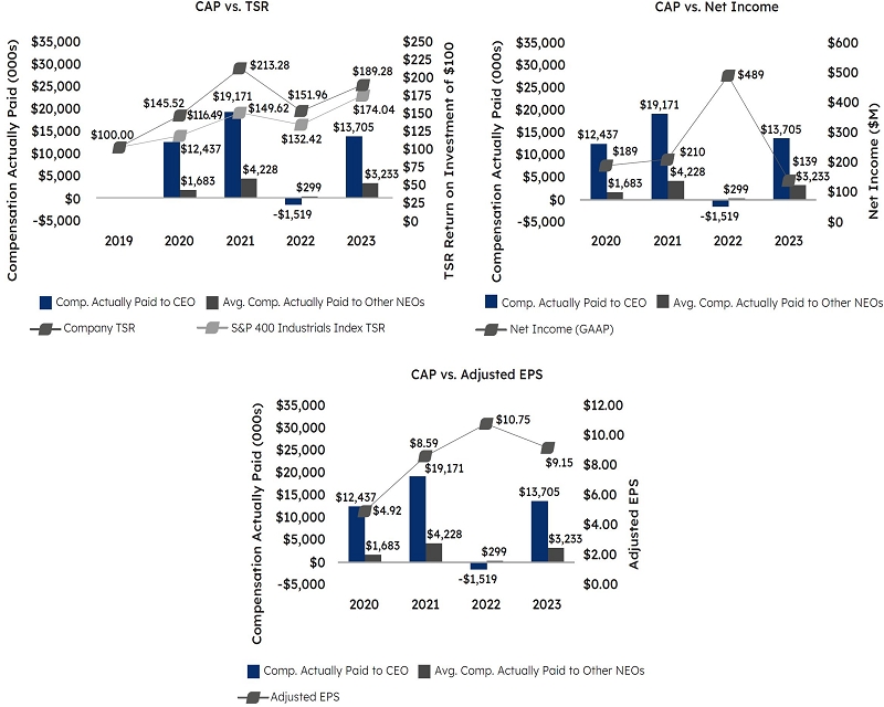 Below are graphs showing the relationship of “compensation actually paid” to our PEO and non-PEO NEOs in 2020, 2021, 2022 and 2023, to (1) our TSR and the TSR of the S&P 400 Industrials Index, (2) our net income and (3) our adjusted earnings per share.