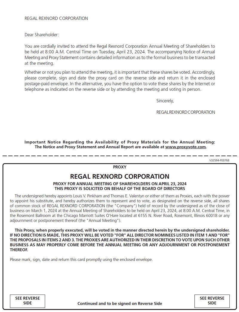 Our proxy statement contains information about the matters that will be voted on at our 2024 Annual Meeting of Shareholders and all adjournments or postponements thereof (the “Annual Meeting”) as well as other helpful information about Regal Rexnord Corporation (“we”, “our” or the “Company”). Below is an executive summary that highlights certain information contained elsewhere in this proxy statement. We encourage you to read the entire proxy statement and all accompanying materials, including our 2023 Annual Report, carefully before voting your shares.