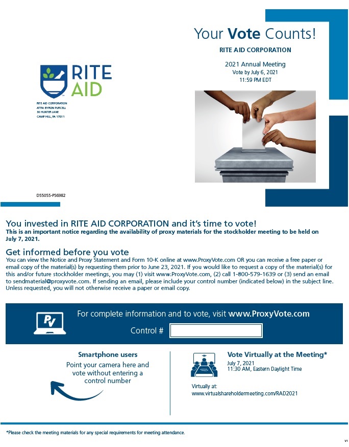 Your Vote Counts! RITE AID CORPORATION 2021 Annual Meeting Vote by July 6, 2021 11:59 PM EDTRITE AID CORPORATION ATTN: BYRON PURCELL 30 HUNTER LANE CAMP HILL, PA 17011D54855-P56982You invested in RITE AID CORPORATION and it’s time to vote! This is an important notice regarding the availability of proxy materials for the stockholder meeting to be held on July 7, 2021. Get informed before you vote You can view the Notice and Proxy Statement and Form 10-K online at www.ProxyVote.com OR you can receive a free paper or email copy of the material(s) by requesting them prior to June 23, 2021. If you would like to request a copy of the material(s) for this and/or future stockholder meetings, you may (1) visit www.ProxyVote.com, (2) call 1-800-579-1639 or (3) send an email to sendmaterial@proxyvote.com. If sending an email, please include your control number (indicated below) in the subject line. Unless requested, you will not otherwise receive a paper or email copy.For complete information and to vote, visit www.ProxyVote.com Control #Smartphone users Point your camera here and vote without entering a control numberVirtually at:Vote Virtually at the Meeting* July 7, 2021 11:30 AM, Eastern Daylight Timewww.virtualshareholdermeeting.com/RAD2021*Please check the meeting materials for any special requirements for meeting attendance.