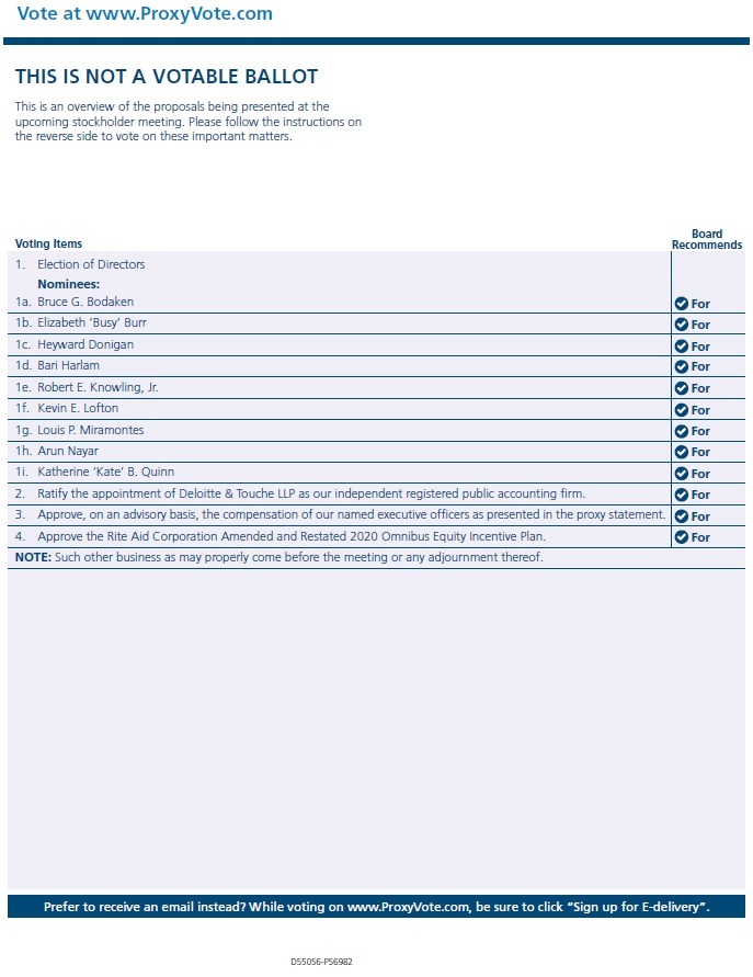 Vote at www.ProxyVote.comTHIS IS NOT A VOTABLE BALLOT This is an overview of the proposals being presented at the upcoming stockholder meeting. Please follow the instructions on the reverse side to vote on these important matters.Voting Items 1. Election of Directors Nominees: 1a. Bruce G. Bodaken 1b. Elizabeth ‘Busy’ Burr 1c. Heyward Donigan 1d. Bari Harlam 1e. Robert E. Knowling, Jr. 1f. Kevin E. Lofton 1g. Louis P. Miramontes 1h. Arun Nayar 1i. Katherine ‘Kate’ B. Quinn 2. Ratify the appointment of Deloitte & Touche LLP as our independent registered public accounting firm. 3. Approve, on an advisory basis, the compensation of our named executive officers as presented in the proxy statement. 4. Approve the Rite Aid Corporation Amended and Restated 2020 Omnibus Equity Incentive Plan. 5. Consider a stockholder proposal, if properly presented at the Annual Meeting, requesting a report on continued in- store tobacco sales in the age of COVID-19. NOTE: Such other business as may properly come before the meeting or any adjournment thereof.Board RecommendsFor For For For For For For For For For For For AgainstPrefer to receive an email instead? While voting on www.ProxyVote.com, be sure to click “Sign up for E-delivery”.