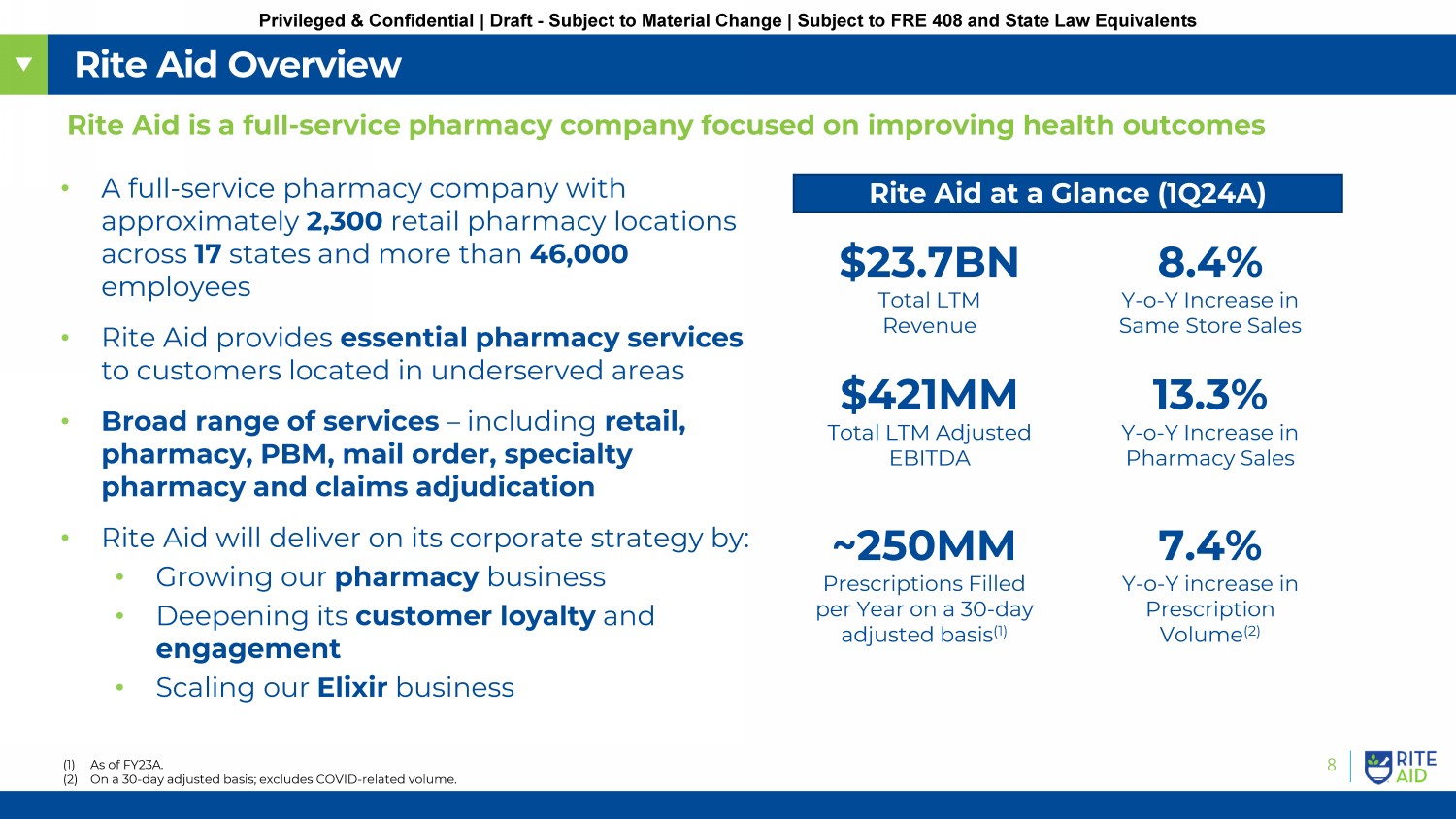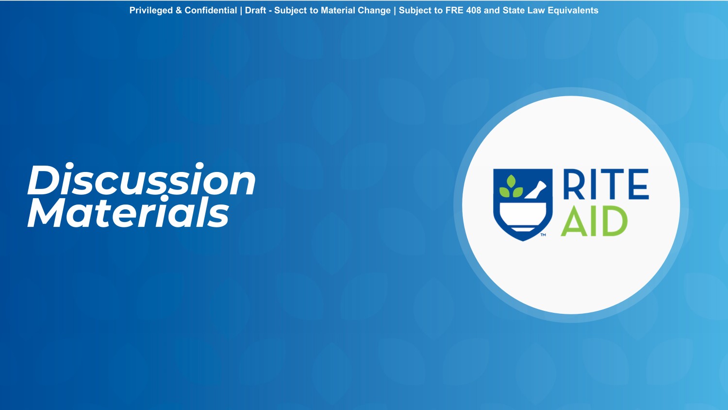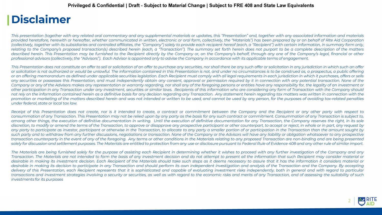 © 2020 Rite Aid. All rights reserved. 1 Privileged & Confidential | Draft - Subject to Material Change | Subject to FRE 408 and State Law Equivalents September 16, 2023 Discussion Materials Privileged & Confidential | Draft - Subject to Material Change | Subject to FRE 408 and State Law Equivalents