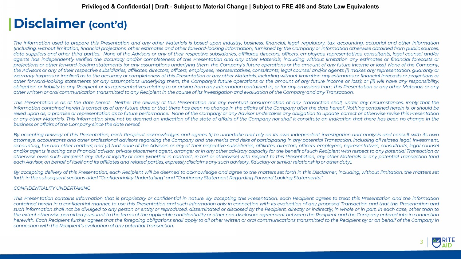 2 Disclaimer This presentation (together with any related oral commentary and any supplemental materials or updates, this “Presentation” and, together with any associated information and materials provided heretofore, herewith or hereafter, whether communicated in written, electronic or oral form, collectively, the “Materials”) has been prepared by or on behalf of Rite Aid Corporation (collectively, together with its subsidiaries and controlled affiliates, the “Company”) solely to provide each recipient hereof (each, a “Recipient”) with certain information, in summary form only, relating to the Company’s proposed transaction(s) described herein (each, a “Transaction”) . The summary set forth herein does not purport to be a complete description of the matters described herein . This Presentation may be furnished to the Recipient directly by the Company or, on the Company’s behalf, through any one of the Company’s legal, financial or other professional advisors (collectively, the “Advisors”) . Each Advisor is appointed only to advise the Company in accordance with its applicable terms of engagement . This Presentation does not constitute an offer to sell or solicitation of an offer to purchase any securities, nor shall there be any such offer or solicitation in any jurisdiction in which such an offer or solicitation is not authorized or would be unlawful . The information contained in this Presentation is not, and under no circumstances is to be construed as, a prospectus, a public offering or an offering memorandum as defined under applicable securities legislation . Each Recipient must comply with all legal requirements in each jurisdiction in which it purchases, offers or sells any securities or possesses this Presentation, and must independently obtain any consent, approval or permission required by it in connection with any potential transaction . None of the Company or any of the Advisors makes any representation or warranty regarding, nor shall any of the foregoing persons or entities have any responsibility for, the legality of an investment or other participation in any Transaction under any investment, securities or similar laws . Recipients of this information who are considering any form of Transaction with the Company should not rely on the information contained herein as a definitive basis for any decision regarding any Transaction . Any statement herein regarding tax matters was written in connection with the promotion or marketing of the matters described herein and was not intended or written to be used, and cannot be used by any person, for the purposes of avoiding tax - related penalties under federal, state or local tax law . Receipt of this Presentation does not create, nor is it intended to create, a contract or commitment between the Company and the Recipient or any other party with respect to consummation of any Transaction . This Presentation may not be relied upon by any party as the basis for any such contract or commitment . Consummation of any Transaction is subject to, among other things, the execution of definitive documentation in writing . Until the execution of definitive documentation for any Transaction, the Company reserves the right, in its sole discretion, to modify or amend the terms of the Transaction, to approve or disapprove any prospective participant or other counterpart, to accept or reject, in whole or in part, any request by any party to participate as investor, participant or otherwise in the Transaction, to allocate to any party a smaller portion of or participation in the Transaction than the amount sought by such party and to withdraw from any further discussions, negotiations or transaction . None of the Company or the Advisors will have any liability or obligation whatsoever to any prospective transaction counterparty in the event of any of the foregoing . Any terms or other conditions in the Materials relating to any proposed Transaction are non - binding and are being presented solely for discussion and settlement purposes . The Materials are entitled to protection from any use or disclosure pursuant to Federal Rule of Evidence 408 and any other rule of similar import . The Materials are being furnished solely for the purpose of assisting each Recipient in determining whether it wishes to proceed with any further investigation of the Company and any Transaction . The Materials are not intended to form the basis of any investment decision and do not attempt to present all the information that such Recipient may consider material or desirable in making its investment decision . Each Recipient of the Materials should take such steps as it deems necessary to assure that it has the information it considers material or desirable in making its decision to participate in any Transaction and should perform its own independent investigation and analysis of the Transaction and the Company . By accepting delivery of this Presentation, each Recipient represents that it is sophisticated and capable of evaluating investment risks independently, both in general and with regard to particular transactions and investment strategies involving a security or securities, as well as with regard to the economic risks and merits of any Transaction, and of assessing the suitability of such investments for its purposes Privileged & Confidential | Draft - Subject to Material Change | Subject to FRE 408 and State Law Equivalents