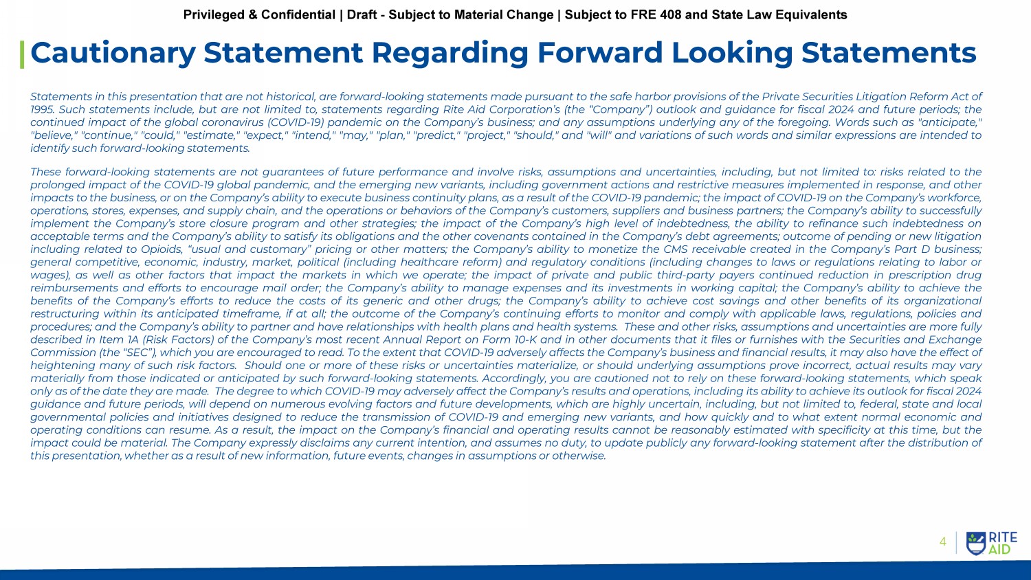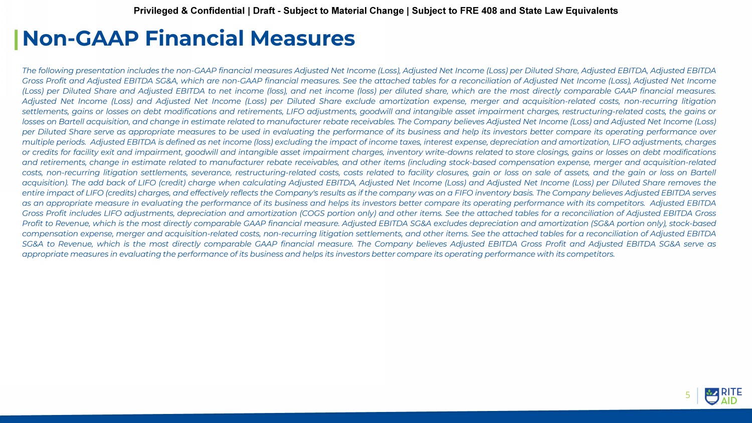 4 Cautionary Statement Regarding Forward Looking Statements Statements in this presentation that are not historical, are forward - looking statements made pursuant to the safe harbor provisions of the Private Securities Litigation Reform Act of 1995 . Such statements include, but are not limited to, statements regarding Rite Aid Corporation’s (the “Company”) outlook and guidance for fiscal 2024 and future periods ; the continued impact of the global coronavirus (COVID - 19 ) pandemic on the Company’s business ; and any assumptions underlying any of the foregoing . Words such as "anticipate," "believe," "continue," "could," "estimate," "expect," "intend," "may," "plan," "predict," "project," "should," and "will" and variations of such words and similar expressions are intended to identify such forward - looking statements . These forward - looking statements are not guarantees of future performance and involve risks, assumptions and uncertainties, including, but not limited to : risks related to the prolonged impact of the COVID - 19 global pandemic, and the emerging new variants, including government actions and restrictive measures implemented in response, and other impacts to the business, or on the Company’s ability to execute business continuity plans, as a result of the COVID - 19 pandemic ; the impact of COVID - 19 on the Company’s workforce, operations, stores, expenses, and supply chain, and the operations or behaviors of the Company’s customers, suppliers and business partners ; the Company’s ability to successfully implement the Company’s store closure program and other strategies ; the impact of the Company’s high level of indebtedness, the ability to refinance such indebtedness on acceptable terms and the Company’s ability to satisfy its obligations and the other covenants contained in the Company’s debt agreements ; outcome of pending or new litigation including related to Opioids, “usual and customary” pricing or other matters ; the Company’s ability to monetize the CMS receivable created in the Company’s Part D business ; general competitive, economic, industry, market, political (including healthcare reform) and regulatory conditions (including changes to laws or regulations relating to labor or wages), as well as other factors that impact the markets in which we operate ; the impact of private and public third - party payers continued reduction in prescription drug reimbursements and efforts to encourage mail order ; the Company’s ability to manage expenses and its investments in working capital ; the Company’s ability to achieve the benefits of the Company’s efforts to reduce the costs of its generic and other drugs ; the Company’s ability to achieve cost savings and other benefits of its organizational restructuring within its anticipated timeframe, if at all ; the outcome of the Company’s continuing efforts to monitor and comply with applicable laws, regulations, policies and procedures ; and the Company’s ability to partner and have relationships with health plans and health systems . These and other risks, assumptions and uncertainties are more fully described in Item 1 A (Risk Factors) of the Company’s most recent Annual Report on Form 10 - K and in other documents that it files or furnishes with the Securities and Exchange Commission (the “SEC”), which you are encouraged to read . To the extent that COVID - 19 adversely affects the Company’s business and financial results, it may also have the effect of heightening many of such risk factors . Should one or more of these risks or uncertainties materialize, or should underlying assumptions prove incorrect, actual results may vary materially from those indicated or anticipated by such forward - looking statements . Accordingly, you are cautioned not to rely on these forward - looking statements, which speak only as of the date they are made . The degree to which COVID - 19 may adversely affect the Company’s results and operations, including its ability to achieve its outlook for fiscal 2024 guidance and future periods, will depend on numerous evolving factors and future developments, which are highly uncertain, including, but not limited to, federal, state and local governmental policies and initiatives designed to reduce the transmission of COVID - 19 and emerging new variants, and how quickly and to what extent normal economic and operating conditions can resume . As a result, the impact on the Company’s financial and operating results cannot be reasonably estimated with specificity at this time, but the impact could be material . The Company expressly disclaims any current intention, and assumes no duty, to update publicly any forward - looking statement after the distribution of this presentation, whether as a result of new information, future events, changes in assumptions or otherwise . Privileged & Confidential | Draft - Subject to Material Change | Subject to FRE 408 and State Law Equivalents
