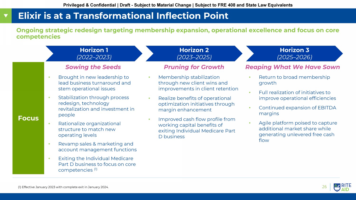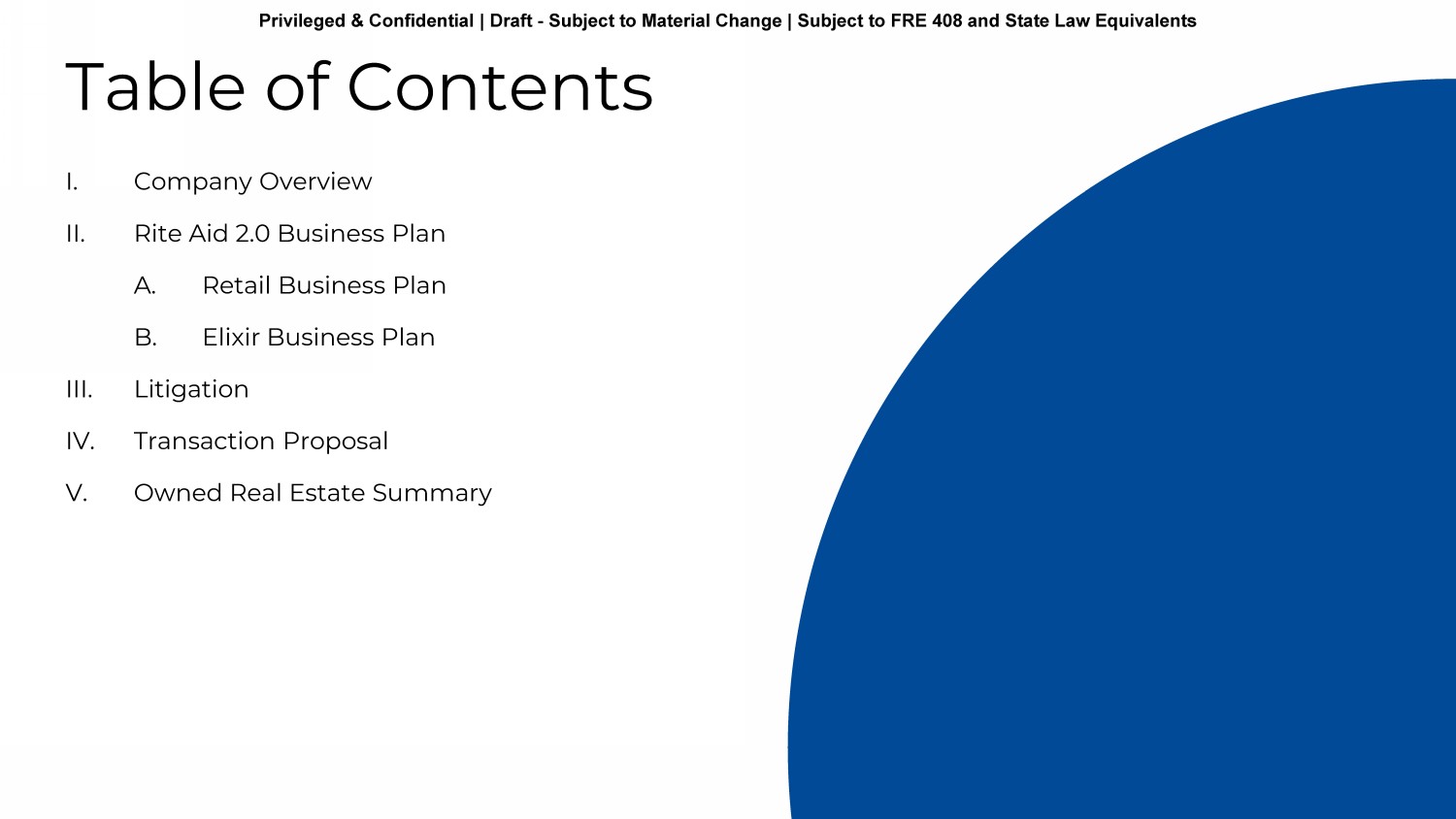 Privileged & Confidential | Draft - Subject to Material Change | Subject to FRE 408 and State Law Equivalents I. Company Overview II. Rite Aid 2.0 Business Plan A. Retail Business Plan B. Elixir Business Plan III. Litigation IV. Transaction Proposal V. Owned Real Estate Summary Table of Contents