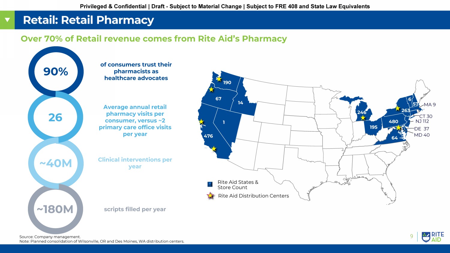 8 Privileged & Confidential | Draft - Subject to Material Change | Subject to FRE 408 and State Law Equivalents Rite Aid Overview • A full - service pharmacy company with approximately 2,300 retail pharmacy locations across 17 states and more than 46,000 employees • Rite Aid provides essential pharmacy services to customers located in underserved areas • Broad range of services – including retail, pharmacy, PBM, mail order, specialty pharmacy and claims adjudication • Rite Aid will deliver on its corporate strategy by: • Growing our pharmacy business • Deepening its customer loyalty and engagement • Scaling our Elixir business Rite Aid is a full - service pharmacy company focused on improving health outcomes Rite Aid at a Glance (1Q24A) $23.7BN Total LTM Revenue $421MM Total LTM Adjusted EBITDA 8.4% Y - o - Y Increase in Same Store Sales 13.3% Y - o - Y Increase in Pharmacy Sales 7.4% Y - o - Y increase in Prescription Volume (2) ~250MM Prescriptions Filled per Year on a 30 - day adjusted basis (1) (1) As of FY23A. (2) On a 30 - day adjusted basis; excludes COVID - related volume.