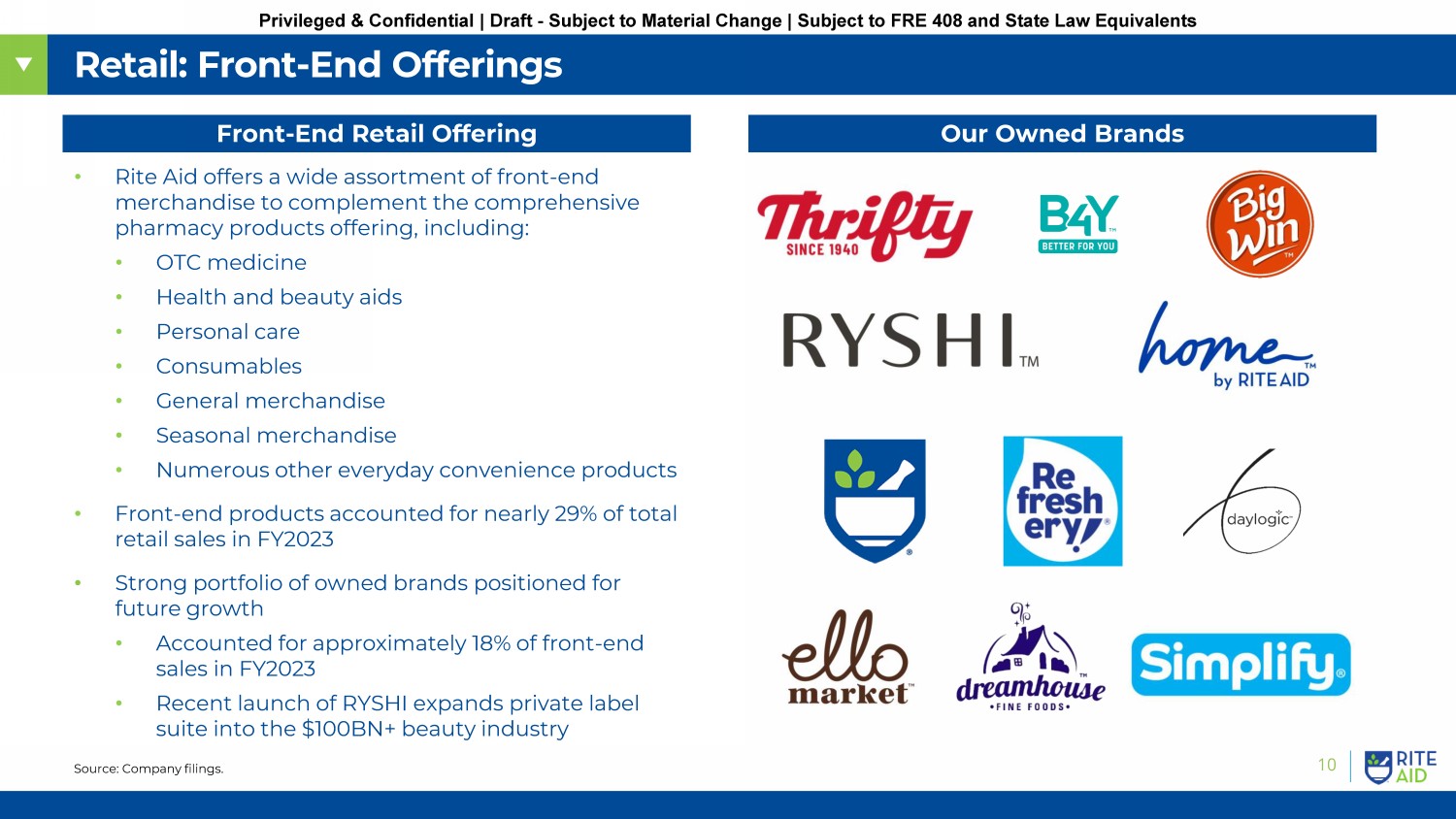 10 Privileged & Confidential | Draft - Subject to Material Change | Subject to FRE 408 and State Law Equivalents Retail: Front - End Offerings Our Owned Brands • Rite Aid offers a wide assortment of front - end merchandise to complement the comprehensive pharmacy products offering, including: • OTC medicine • Health and beauty aids • Personal care • Consumables • General merchandise • Seasonal merchandise • Numerous other everyday convenience products • Front - end products accounted for nearly 29% of total retail sales in FY2023 • Strong portfolio of owned brands positioned for future growth • Accounted for approximately 18% of front - end sales in FY2023 • Recent launch of RYSHI expands private label suite into the $100BN+ beauty industry Source: Company filings. Front - End Retail Offering