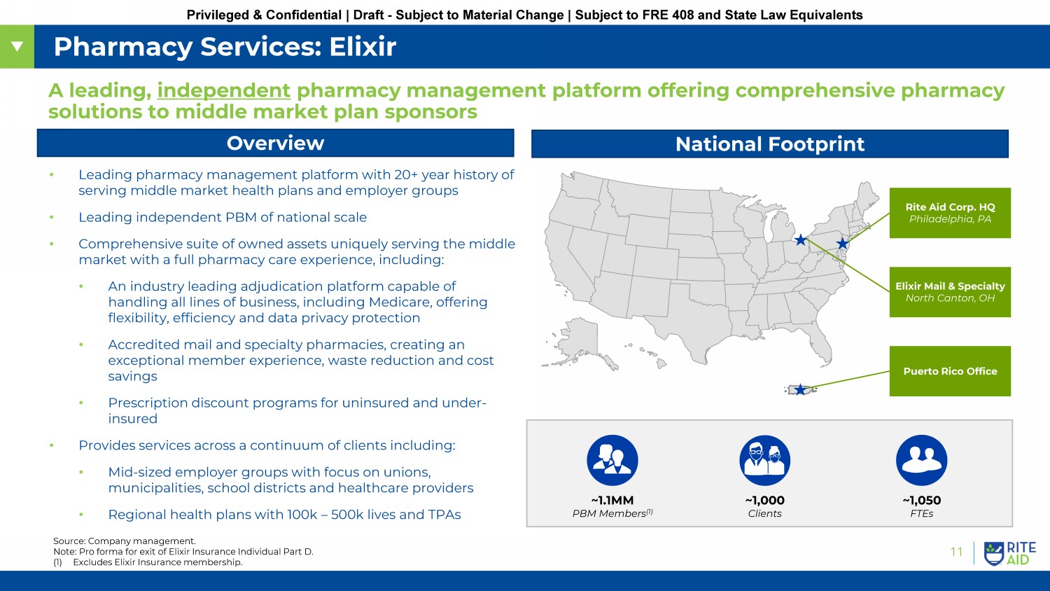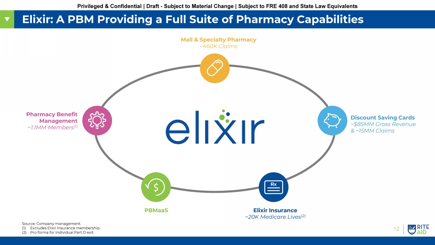 11 Privileged & Confidential | Draft - Subject to Material Change | Subject to FRE 408 and State Law Equivalents Pharmacy Services: Elixir A leading, independent pharmacy management platform offering comprehensive pharmacy solutions to middle market plan sponsors Overview National Footprint ~1.1MM PBM Members (1) ~1,000 Clients Rite Aid Corp. HQ Philadelphia, PA Elixir Mail & Specialty North Canton, OH Puerto Rico Office ~1,050 FTEs • Leading pharmacy management platform with 20+ year history of serving middle market health plans and employer groups • Leading independent PBM of national scale • Comprehensive suite of owned assets uniquely serving the middle market with a full pharmacy care experience, including: • An industry leading adjudication platform capable of handling all lines of business, including Medicare, offering flexibility, efficiency and data privacy protection • Accredited mail and specialty pharmacies, creating an exceptional member experience, waste reduction and cost savings • Prescription discount programs for uninsured and under - insured • Provides services across a continuum of clients including: • Mid - sized employer groups with focus on unions, municipalities, school districts and healthcare providers • Regional health plans with 100k – 500k lives and TPAs Source: Company management. Note: Pro forma for exit of Elixir Insurance Individual Part D. (1) Excludes Elixir Insurance membership.