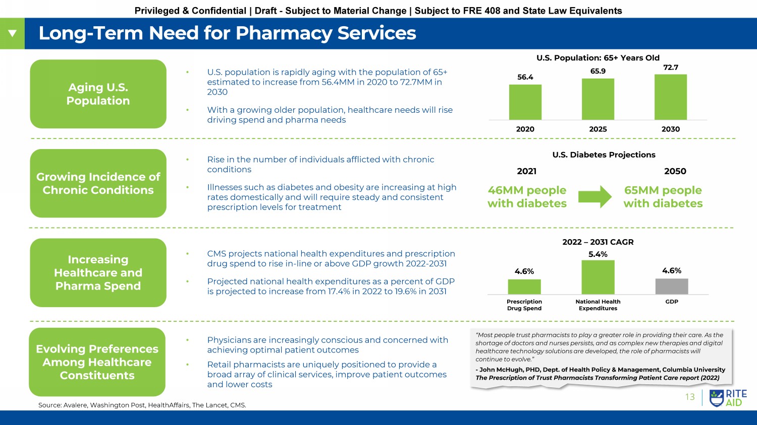 13 Privileged & Confidential | Draft - Subject to Material Change | Subject to FRE 408 and State Law Equivalents Aging U.S. Population Growing Incidence of Chronic Conditions Increasing Healthcare and Pharma Spend Evolving Preferences Among Healthcare Constituents Long - Term Need for Pharmacy Services • U.S. population is rapidly aging with the population of 65+ estimated to increase from 56.4MM in 2020 to 72.7MM in 2030 • With a growing older population, healthcare needs will rise driving spend and pharma needs • Rise in the number of individuals afflicted with chronic conditions • Illnesses such as diabetes and obesity are increasing at high rates domestically and will require steady and consistent prescription levels for treatment • CMS projects national health expenditures and prescription drug spend to rise in - line or above GDP growth 2022 - 2031 • Projected national health expenditures as a percent of GDP is projected to increase from 17.4% in 2022 to 19.6% in 2031 • Physicians are increasingly conscious and concerned with achieving optimal patient outcomes • Retail pharmacists are uniquely positioned to provide a broad array of clinical services, improve patient outcomes and lower costs 2022 – 2031 CAGR U.S. Population: 65+ Years Old Source: Avalere, Washington Post, HealthAffairs, The Lancet, CMS. U.S. Diabetes Projections 46MM people with diabetes 2021 65MM people with diabetes 2050 “Most people trust pharmacists to play a greater role in providing their care. As the shortage of doctors and nurses persists, and as complex new therapies and digital healthcare technology solutions are developed, the role of pharmacists will continue to evolve.” - John McHugh, PHD, Dept. of Health Policy & Management, Columbia University The Prescription of Trust Pharmacists Transforming Patient Care report (2022) 56.4 65.9 72.7 2020 2025 2030 4.6% 5.4% 4.6% Prescription Drug Spend National Health Expenditures GDP