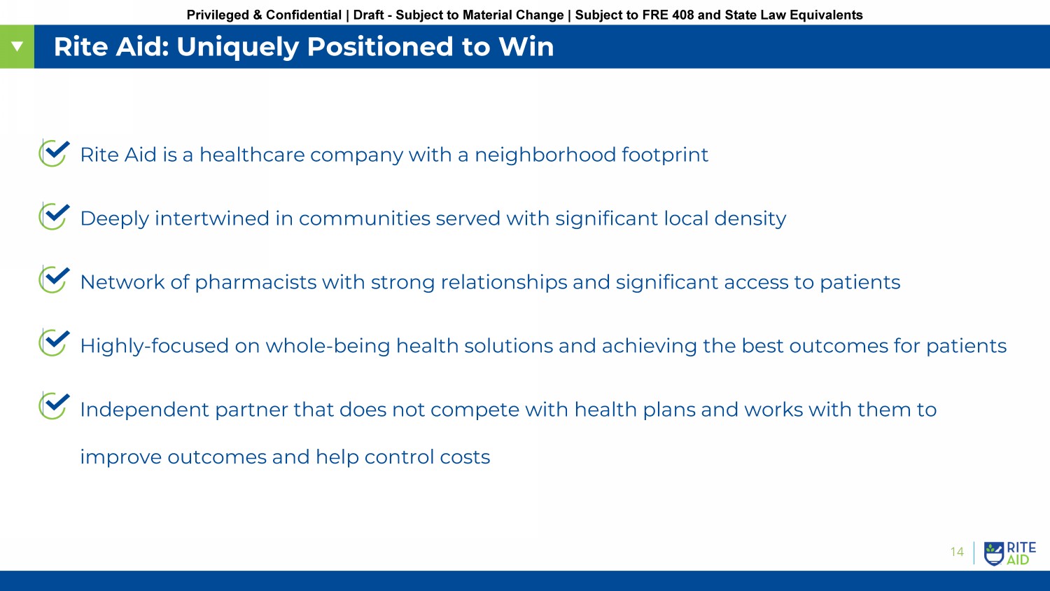 14 Privileged & Confidential | Draft - Subject to Material Change | Subject to FRE 408 and State Law Equivalents Rite Aid: Uniquely Positioned to Win ▪ Rite Aid is a healthcare company with a neighborhood footprint ▪ Deeply intertwined in communities served with significant local density ▪ Network of pharmacists with strong relationships and significant access to patients ▪ Highly - focused on whole - being health solutions and achieving the best outcomes for patients ▪ Independent partner that does not compete with health plans and works with them to improve outcomes and help control costs