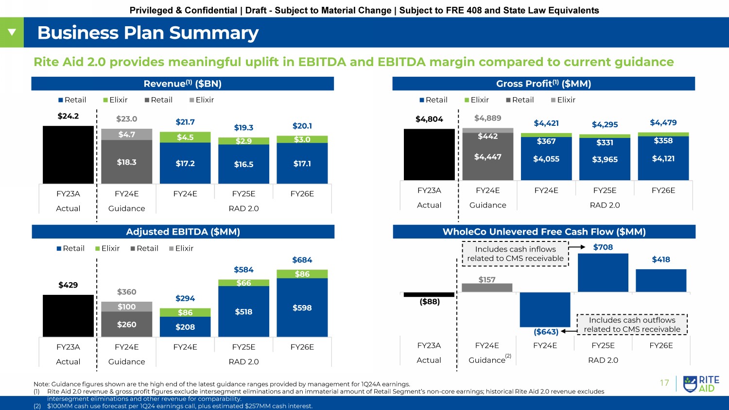 16 Privileged & Confidential | Draft - Subject to Material Change | Subject to FRE 408 and State Law Equivalents Our vision for Rite Aid 2.0 is to create a portfolio of high - performing stores to deliver value to our stakeholders and improved health and wellness outcomes to our customers Overview of Rite Aid 2.0 Business Plan Rite Aid Today (LTM 1Q24A) Rite Aid 2.0 (FY25E) 2,287 Stores $17.8BN Retail Sales (1) $284MM Retail Segment EBITDA (2) 1.6% Retail Segment EBITDA Margin (2) ~78,000 LTM Scripts / Store $421MM Total Adj. EBITDA ~$83MM Dead Rent (3) 1.8% Total EBITDA Margin Reduced Store Footprint $16.5BN Retail Sales (1) $518MM Retail Segment EBITDA (2) 3.1% Retail Segment EBITDA Margin (2) $584MM Total Adj. EBITDA $0 Dead Rent 3.0% Total EBITDA Margin • The Company’s portfolio is burdened by unprofitable stores that it is unable to effectively exit due to the associated dead rent; additionally, increasing regional and corporate overhead costs have impacted profitability • The ability to reject leases will allow the Company to rationalize the store footprint with greater flexibility; it can exit unprofitable locations, shed dead rent and use the threat of lease rejection to negotiate better lease terms • A smaller footprint, coupled with the ability to reject contracts, creates the opportunity for significant cost rationalization and enhanced profitability (1) Excludes immaterial non - core other revenue and intersegment eliminations. (2) For the avoidance of doubt, burdened by allocated costs associated with distribution centers, regional offices, advertising a nd corporate overhead. (3) FY24E estimated dead rent in status quo. ~87,000 LTM Scripts / Store