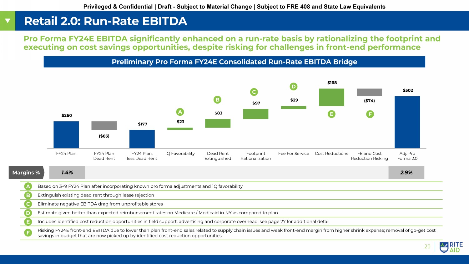 19 Privileged & Confidential | Draft - Subject to Material Change | Subject to FRE 408 and State Law Equivalents $288 214 $168 $140 $142 $177 $83 $260 ($74) ($6) ($206) ($178) ($42) ($47) ($9) FY23A EBITDA FY23A Dead Rent FY23A, less Dead Rent Wks Adj. Generic Cost & Other Rx GP Reimb. Rate Script Growth Covid Vol. & GM FE Initiatives Wage Increases Other SG&A Add. Dead Rent in FY24 Plan FY24 Plan, Less Dead Rent FY24 Plan Dead Rent FY24 Plan Retail Baseline: Year - Over - Year (“YoY”) Bridge YoY the FY24E Retail Plan reflects several material assumptions relative to actual FY23A performance Bridging Item Description Wks Adjustment • One - week adjustment from a 53 - week (FY23) to a 52 - week year (FY24) Generic Cost & Other Rx GP • Reflects reduced cost for generic scripts purchased from manufacturers, n et inflation, rebates, legal settlements and other Reimbursement Rate(s) • Reimbursement rate pressure from payors for generic / branded scripts; $206MM margin impact on Plan Sales of ~$3B (~6.3%) Covid Volume & Margin • Reflects ~40% reduction in assumed YoY covid scripts (~5MM to ~3MM) and transition to purchasing model in Aug - 23 (previously 100 % margins, post - Aug. forecast 21% margins) Script Growth • Based on 6.2% non - COVID comp growth as a result of adherence from auto - refill, deletes improvement and file buys FE Initiatives • Digital marketing strategies & inflation • Owned - Brand cost reduction, pricing optimization and other Wage Increases • Assumed at both Retail & Corporate Other SG&A • Investments related to advertising, shelf tags & additional headcount; base increases in Retail Benefits ($18M) & Corp Admin ($1 8M - Non - PPL costs) RX SG&A RX