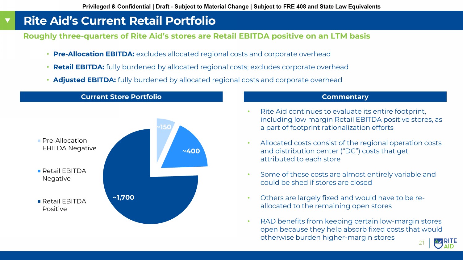 21 Privileged & Confidential | Draft - Subject to Material Change | Subject to FRE 408 and State Law Equivalents Rite Aid’s Current Retail Portfolio Roughly three - quarters of Rite Aid’s stores are Retail EBITDA positive on an LTM basis Commentary • Pre - Allocation EBITDA: excludes allocated regional costs and corporate overhead • Retail EBITDA: fully burdened by allocated regional costs; excludes corporate overhead • Adjusted EBITDA: fully burdened by allocated regional costs and corporate overhead • Rite Aid continues to evaluate its entire footprint, including low margin Retail EBITDA positive stores, as a part of footprint rationalization efforts • Allocated costs consist of the regional operation costs and distribution center (“DC”) costs that get attributed to each store • Some of these costs are almost entirely variable and could be shed if stores are closed • Others are largely fixed and would have to be re - allocated to the remaining open stores • RAD benefits from keeping certain low - margin stores open because they help absorb fixed costs that would otherwise burden higher - margin stores Current Store Portfolio ~150 ~400 ~1,700 Pre-Allocation EBITDA Negative Retail EBITDA Negative Retail EBITDA Positive