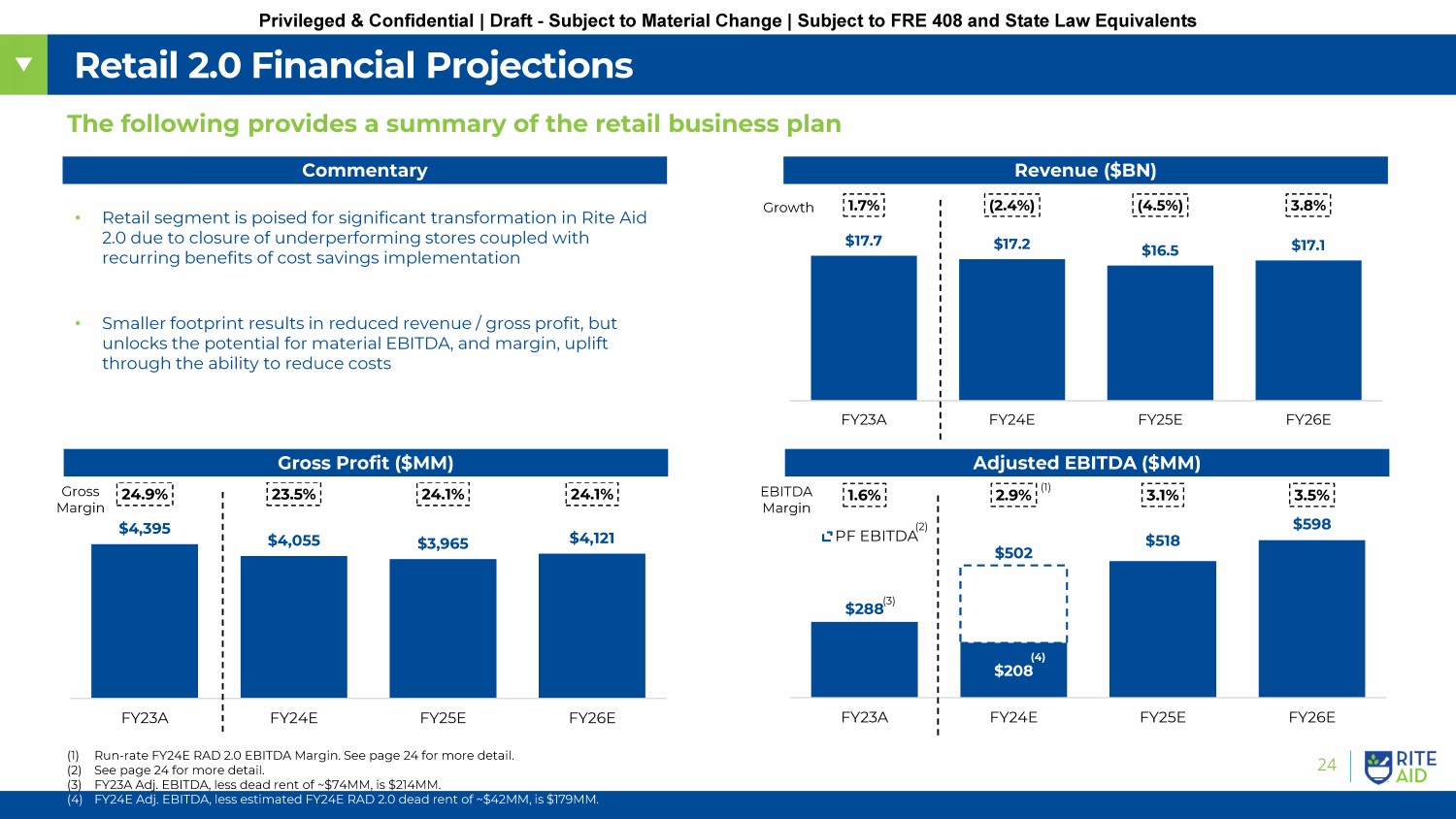 23 Privileged & Confidential | Draft - Subject to Material Change | Subject to FRE 408 and State Law Equivalents Retail 2.0: Cost Reduction Opportunities Retail Operating Cost Reductions Corporate Cost Reductions In addition to footprint rationalization, the Company has developed plans for additional cost rationalization of ~$168MM; TBD items are excluded from business plan assumptions for conservatism Cost Area Opportunity Description Forecast Includes Advertising • Targeting reduction to low ROI spend efforts and redirection of spend from traditional media P Field Support • Organizational redesign; reduction of asset protection resources given store closures at many high - shrink locations P Rent Concessions • Engage with landlords to renegotiate go - forward leases TBD Pour Retention • Potential upside to conservative pour retention rate assumptions TBD Central Fill • Additional central fill facilities could provide additional store opex savings TBD Supply Agreements • Existing supply agreements may have better chance of renegotiation and improved Rx pricing with a healthier balance sheet TBD Distribution • Potential to further consolidate distribution centers with smaller footprint • Opportunity to sublease excess capacity in centers with fewer locations to fulfill TBD Cost Area Opportunity Description Forecast Includes IT & Support Agmts. • Ability to reject unnecessary and overly expensive contracts P Outsourced Tech • Field tech services, recruiting, insourcing, CRM and miscellaneous admin vendors P Legal Fees • Ability to reduce spend based on litigation addressed in restructuring transaction P Corporate Wages • Clean slate review of all corporate G&A necessities P Other • D&O insurance, rent, recruiting, travel, outside labor and other miscellaneous P