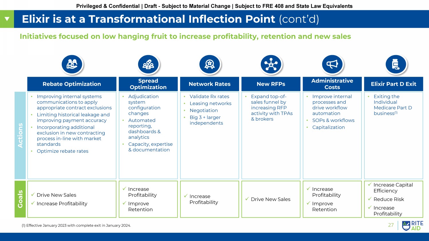 26 Privileged & Confidential | Draft - Subject to Material Change | Subject to FRE 408 and State Law Equivalents Elixir is at a Transformational Inflection Point Ongoing strategic redesign targeting membership expansion, operational excellence and focus on core competencies Focus Sowing the Seeds Pruning for Growth Reaping What We Have Sown Horizon 1 (2022 – 2023) Horizon 2 (2023 – 2025) Horizon 3 (2025 – 2026) • Brought in new leadership to lead business turnaround and stem operational issues • Stabilization through process redesign, technology revitalization and investment in people • Rationalize organizational structure to match new operating levels • Revamp sales & marketing and account management functions • Exiting the Individual Medicare Part D business to focus on core competencies (1) • Membership stabilization through new client wins and improvements in client retention • Realize benefits of operational optimization initiatives through margin enhancement • Improved cash flow profile from working capital benefits of exiting Individual Medicare Part D business • Return to broad membership growth • Full realization of initiatives to improve operational efficiencies • Continued expansion of EBITDA margins • Agile platform poised to capture additional market share while generating unlevered free cash flow (1) Effective January 2023 with complete exit in January 2024.
