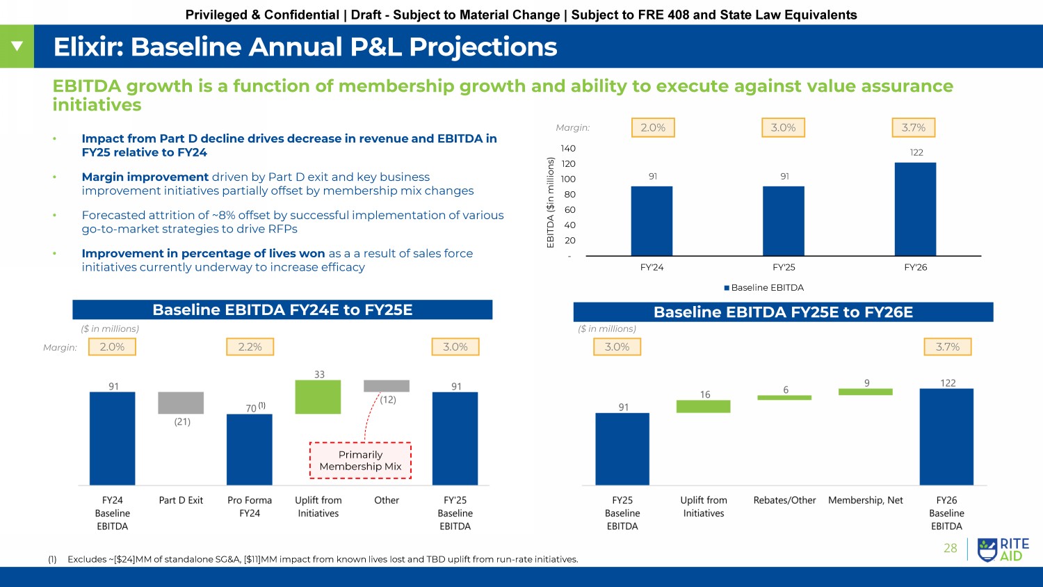 28 Privileged & Confidential | Draft - Subject to Material Change | Subject to FRE 408 and State Law Equivalents 91 91 122 - 20 40 60 80 100 120 140 FY'24 FY'25 FY'26 EBITDA ($in millions) Baseline EBITDA Elixir: Baseline Annual P&L Projections EBITDA growth is a function of membership growth and ability to execute against value assurance initiatives • Impact from Part D decline drives decrease in revenue and EBITDA in FY25 relative to FY24 • Margin improvement driven by Part D exit and key business improvement initiatives partially offset by membership mix changes • Forecasted attrition of ~8% offset by successful implementation of various go - to - market strategies to drive RFPs • Improvement in percentage of lives won as a a result of sales force initiatives currently underway to increase efficacy 3.0% 2.0% 3.7% Margin: Baseline EBITDA FY25E to FY26E Baseline EBITDA FY24E to FY25E 2.0% 2.2% 3.0% 3.0% 3.7% ($ in millions) ($ in millions) Margin: Primarily Membership Mix (1) Excludes ~[$24]MM of standalone SG&A, [$11]MM impact from known lives lost and TBD uplift from run - rate initiatives. (1) No Image