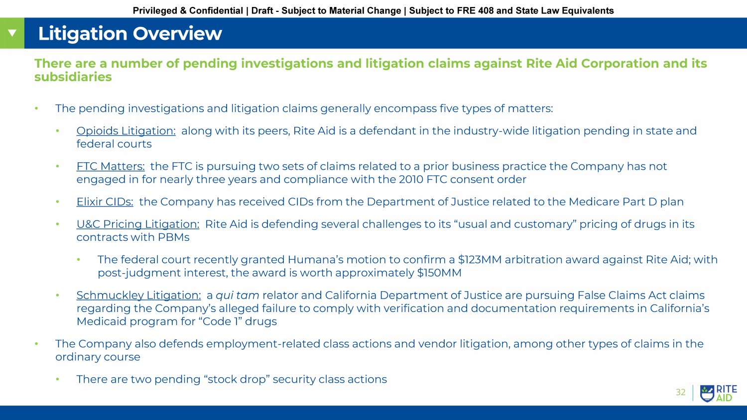 32 Privileged & Confidential | Draft - Subject to Material Change | Subject to FRE 408 and State Law Equivalents Litigation Overview • The pending investigations and litigation claims generally encompass five types of matters: • Opioids Litigation: along with its peers, Rite Aid is a defendant in the industry - wide litigation pending in state and federal courts • FTC Matters: the FTC is pursuing two sets of claims related to a prior business practice the Company has not engaged in for nearly three years and compliance with the 2010 FTC consent order • Elixir CIDs: the Company has received CIDs from the Department of Justice related to the Medicare Part D plan • U&C Pricing Litigation: Rite Aid is defending several challenges to its “usual and customary” pricing of drugs in its contracts with PBMs • The federal court recently granted Humana’s motion to confirm a $123MM arbitration award against Rite Aid; with post - judgment interest, the award is worth approximately $150MM • Schmuckley Litigation: a qui tam relator and California Department of Justice are pursuing False Claims Act claims regarding the Company’s alleged failure to comply with verification and documentation requirements in California’s Medicaid program for “Code 1” drugs • The Company also defends employment - related class actions and vendor litigation, among other types of claims in the ordinary course • There are two pending “stock drop” security class actions There are a number of pending investigations and litigation claims against Rite Aid Corporation and its subsidiaries