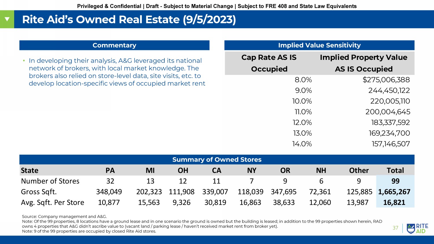 37 Privileged & Confidential | Draft - Subject to Material Change | Subject to FRE 408 and State Law Equivalents Rite Aid’s Owned Real Estate (9/5/2023) Implied Value Sensitivity • In developing their analysis, A&G leveraged its national network of brokers, with local market knowledge. The brokers also relied on store - level data, site visits, etc. to develop location - specific views of occupied market rent Cap Rate AS IS Occupied Implied Property Value AS IS Occupied 8.0% $275,006,388 9.0% 244,450,122 10.0% 220,005,110 11.0% 200,004,645 12.0% 183,337,592 13.0% 169,234,700 14.0% 157,146,507 Summary of Owned Stores Commentary State PA MI OH CA NY OR NH Other Total Number of Stores 32 13 12 11 7 9 6 9 99 Gross Sqft. 348,049 202,323 111,908 339,007 118,039 347,695 72,361 125,885 1,665,267 Avg. Sqft. Per Store 10,877 15,563 9,326 30,819 16,863 38,633 12,060 13,987 16,821 Source: Company management and A&G. Note: Of the 99 properties, 8 locations have a ground lease and in one scenario the ground is owned but the building is lease d; in addition to the 99 properties shown herein, RAD owns 4 properties that A&G didn’t ascribe value to (vacant land / parking lease / haven’t received market rent from broker ye t). Note: 9 of the 99 properties are occupied by closed Rite Aid stores.